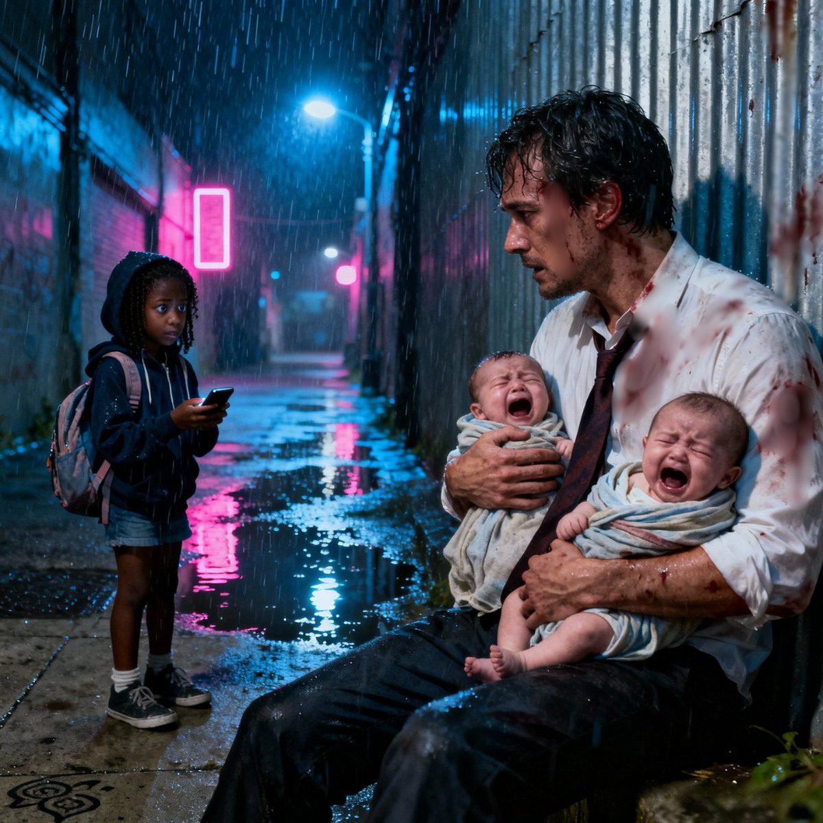 Ze vond hem in een plas regenwater, onder het bloed, terwijl hij twee baby’s vasthield alsof zij het enige bewijs waren dat hij ooit van iets had gehouden.