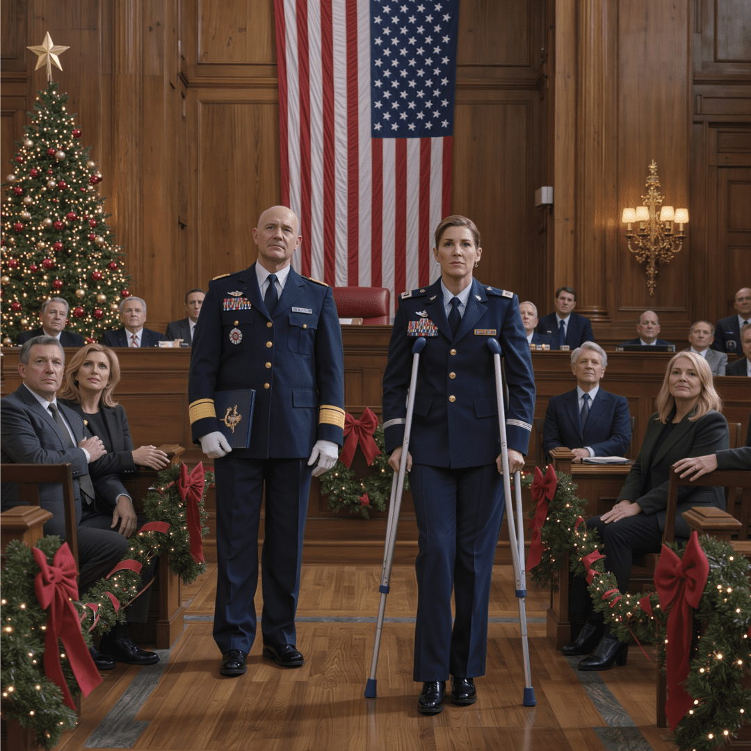 Kolonel Emily Prescott strompelde de federale rechtszaal binnen, elke krukslag weergalmend als een trommel op de marmeren vloer. Het geroezemoes van de advocaten verstomde midden in een zin. De rechter, midden in een zin betrapt, verstijfde. Alle ogen waren gericht op de figuur in uniform bij de ingang.