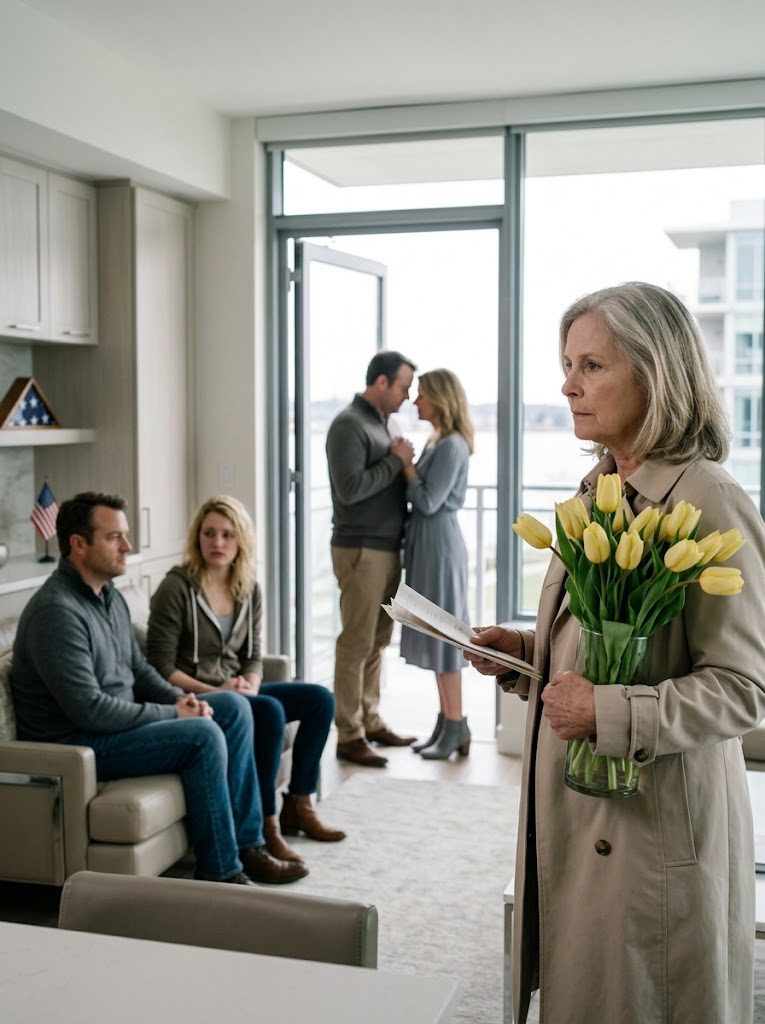 Mijn lichaam stond als aan de grond genageld, maar het huis bleef om me heen ademen. De verwarming fluisterde door de ventilatieopeningen. Ergens klikte een kastje zachtjes, alsof het op zijn plek viel. De tulpen trilden zo zichtbaar in mijn hand dat ik ze even aanstaarde alsof ze van iemand anders waren.