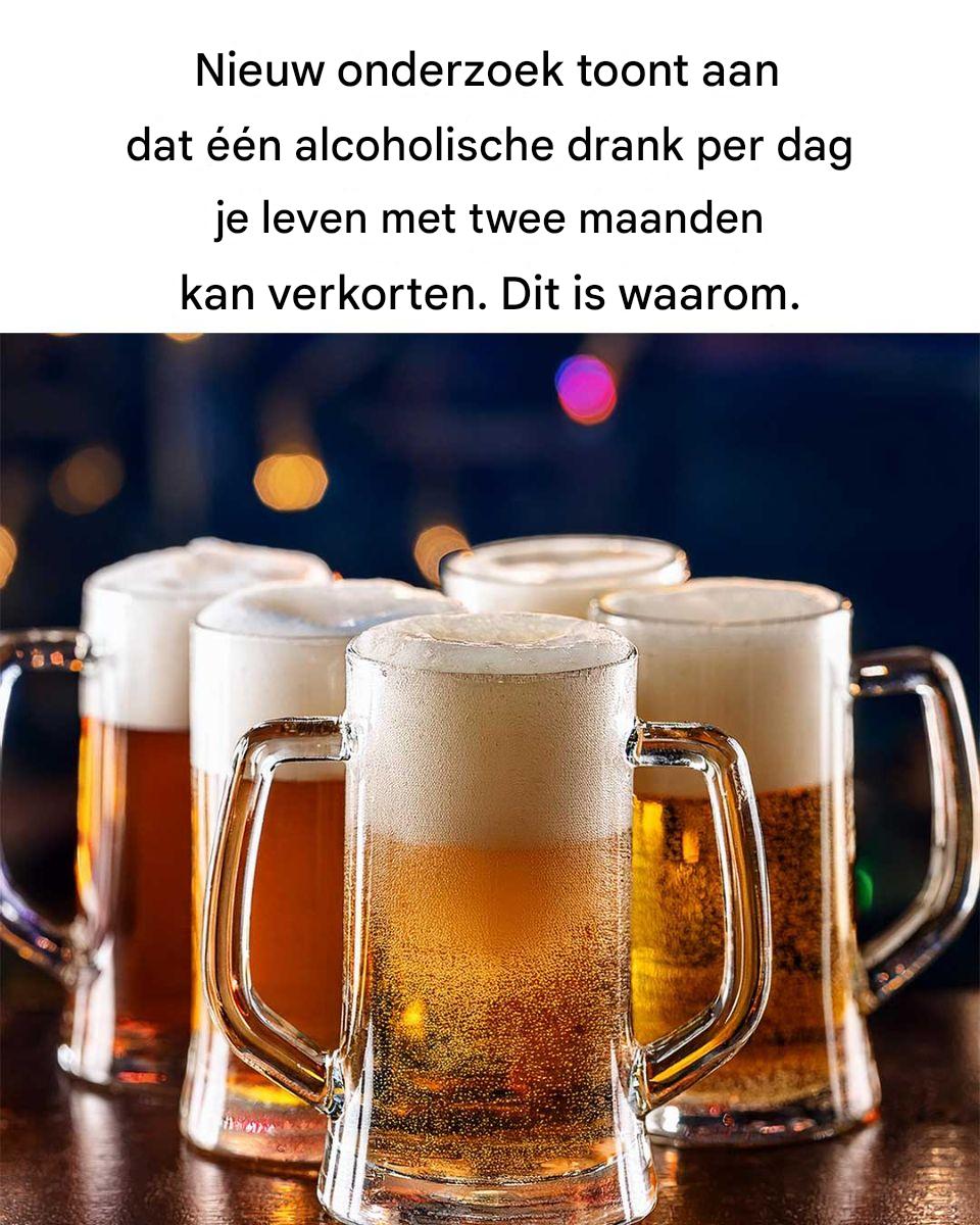 Ondanks de al lang bestaande overtuiging dat matige alcoholconsumptie (zoals één glas wijn of bier per dag) gezondheidsvoordelen kan bieden, suggereren recente studies dat er geen veilige hoeveelheid alcohol bestaat. Zelfs licht tot matig alcoholgebruik verhoogt het risico op ernstige gezondheidsproblemen en kan de levensverwachting verkorten. - Verkorte levensduur :
