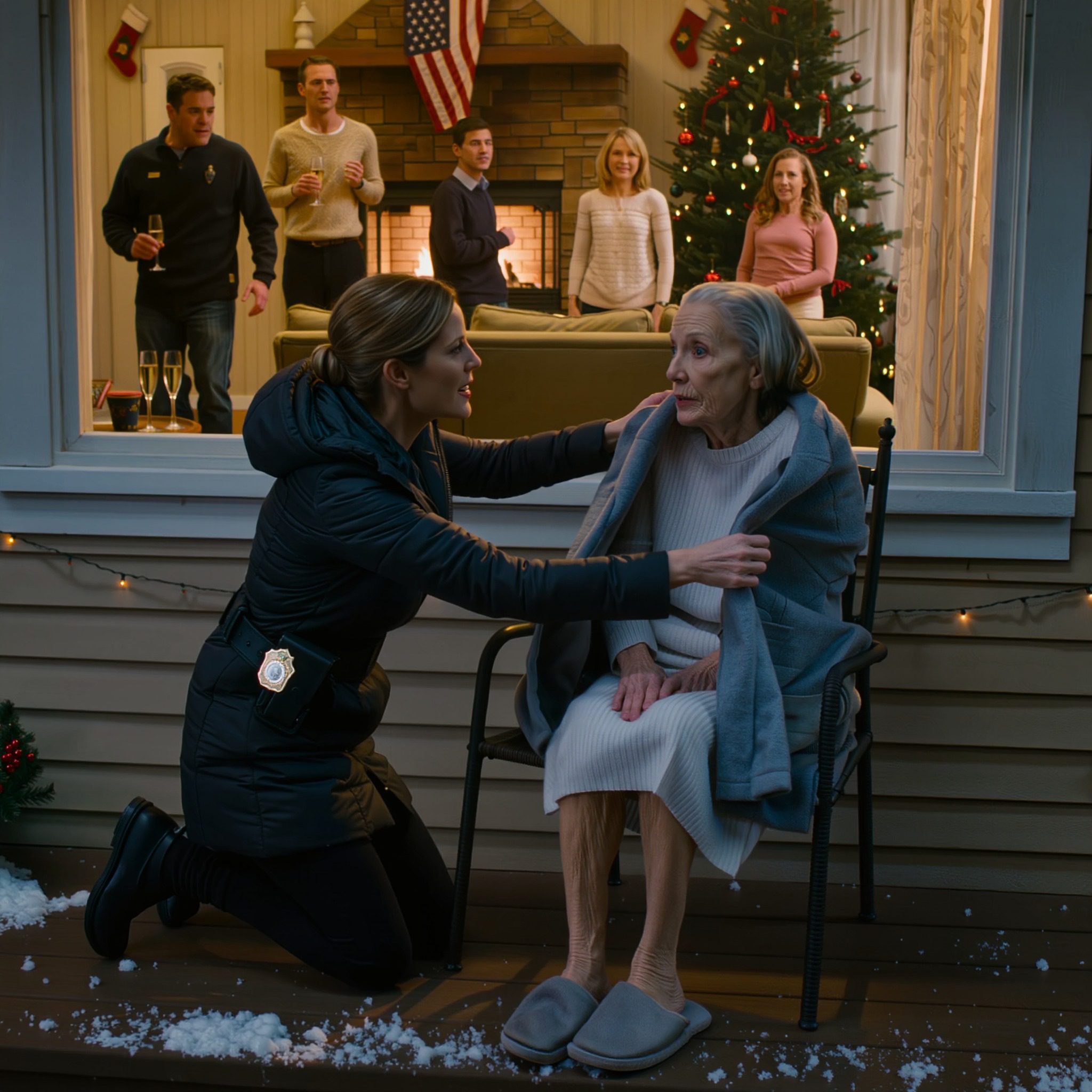 Wat ik aantrof, verbrijzelde me: mijn grootmoeder stond buiten te rillen bij -1°C, zonder deken. Binnen lachte mijn familie en dronk champagne bij de open haard alsof er niets aan de hand was.