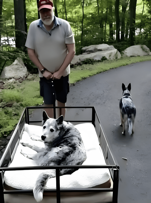 In het karretje lag een oude hond, die nauwelijks bewoog. Een jongere hond liep naast hen.