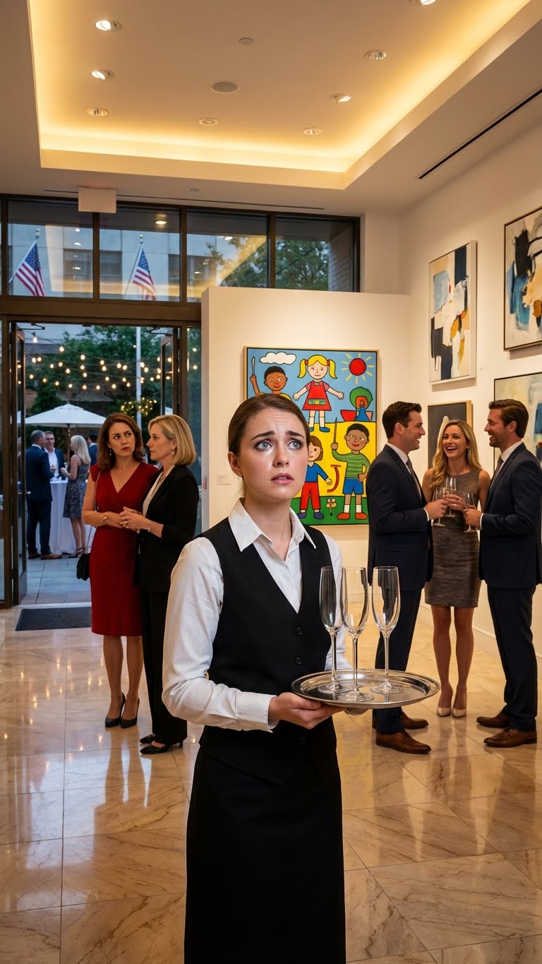 Ik stond champagne te serveren in een kunstgalerie in New York toen ik een schilderij zag dat ik op zesjarige leeftijd had gemaakt, met een prijskaartje van 150.000 dollar – hetzelfde schilderij dat ik mijn moeder had gegeven vlak voordat een maatschappelijk werker me bij haar weghaalde. Toen ik de eigenaar vertelde: « Meneer, dat schilderij is van mij, » lachte hij, riep de beveiliging en zei dat het onmogelijk was, zonder te beseffen dat het pleegkind van wie hij het had gestolen zich nog steeds herinnert wat ze op de achterkant had geschreven.