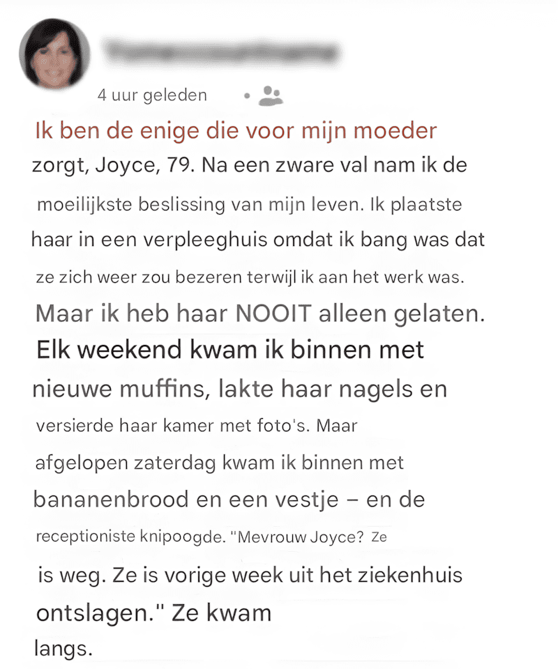 Ik plaatste een bericht in een lokale Facebookgroep met een foto van mijn moeder en een kort onderschrift:
