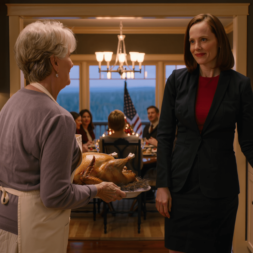 Ik hield de schaal vast met de kalkoen die ik al sinds voor zonsopgang aan het klaarmaken was. Het gewicht ervan drukte op mijn polsen. Boter, rozemarijn en geroosterde uien stegen op in een warme wolk uit de pan. Achter haar, in de eetkamer, hoorde ik het zachte geschraap van stoelen op de houten vloer en de plotselinge stilte die valt wanneer een zaal vol vreemden zich realiseert dat ze te dicht bij een intiem familiemoment staan.