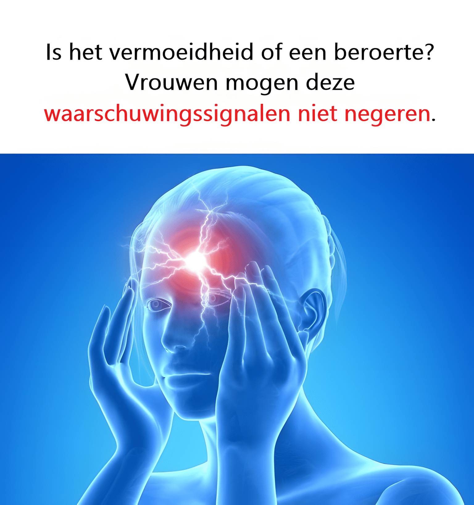 Typische symptomen van een beroerte, die zowel bij mannen als vrouwen voorkomen, kunnen worden onthouden met behulp van het acroniem FAST (Face, Arm, Speech, Time): gezichtsontspanning, zwakte in de armen, moeite met spreken en wanneer u de hulpdiensten moet bellen. Andere symptomen zijn problemen met het gezichtsvermogen in één of beide ogen, evenals evenwichts- of coördinatieproblemen.