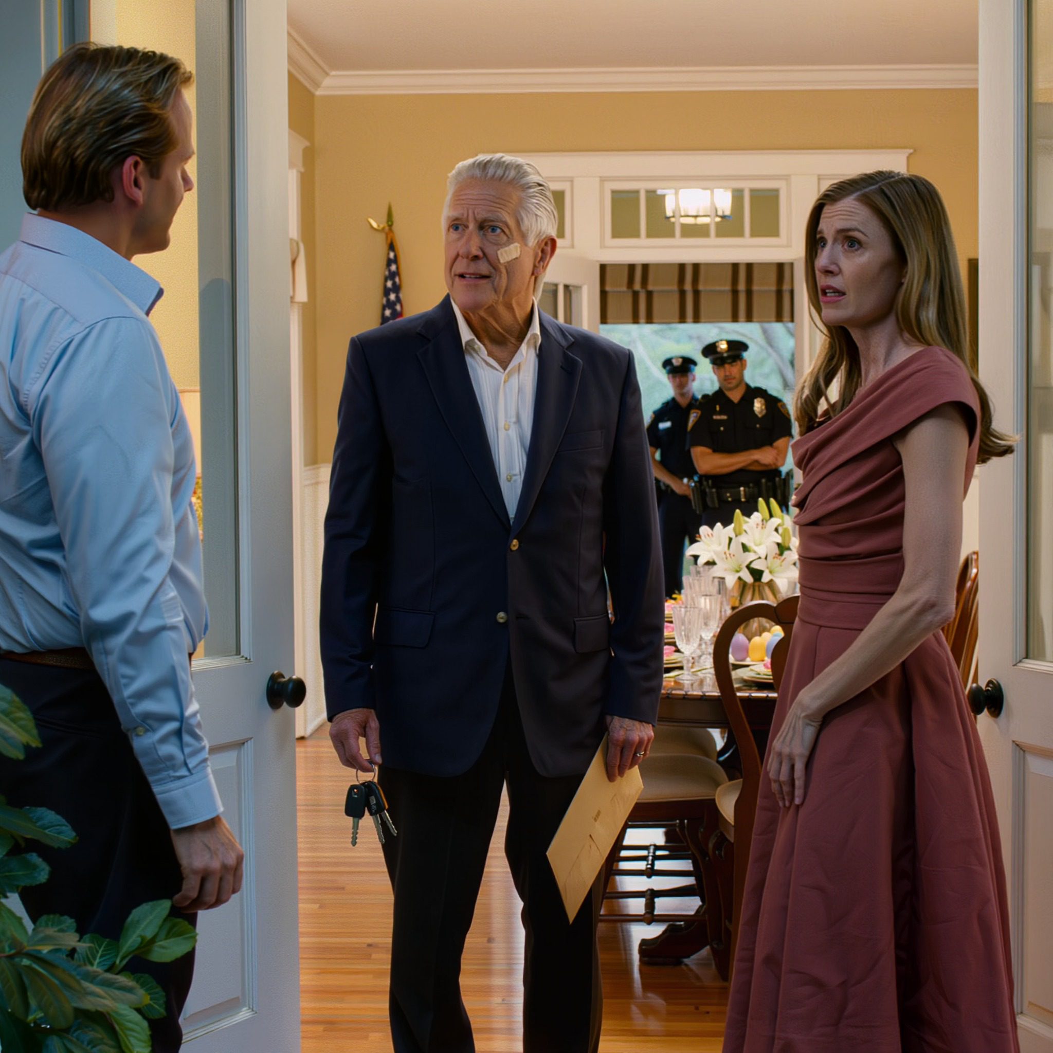Tijdens het paasdiner gooide mijn schoondochter een wijnglas naar me toen ik weigerde haar ouders in huis te laten wonen. « Je bent egoïstisch, » zei mijn zoon. « Je hebt lege kamers, » voegde ze eraan toe. Ik glimlachte, reed zelf naar de spoedeisende hulp en stuurde een berichtje naar mijn advocaat: « Fase één is afgerond. » Minuten later arriveerde de politie.