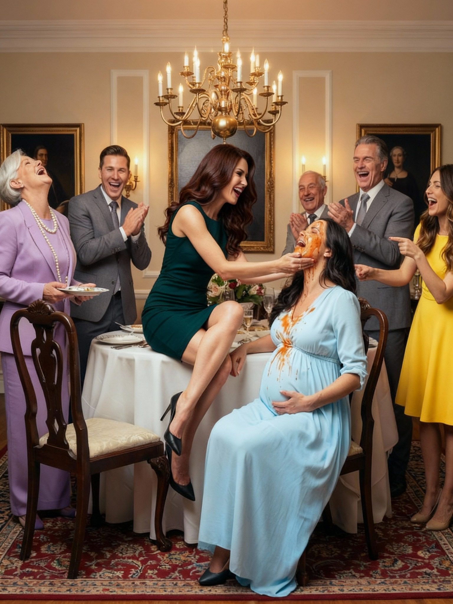 De confrontatie was snel. Charles en Veronica arriveerden onaangekondigd met hun advocaten. Veronica lachte terwijl ze met een schaar in Evelyns trouwjurk knipte, dwars door de naden sneed en rode wijn over de stof goot. ‘Dit verdien je,’ zei ze zachtjes. Nathaniel keek toe. Hij deed niets.