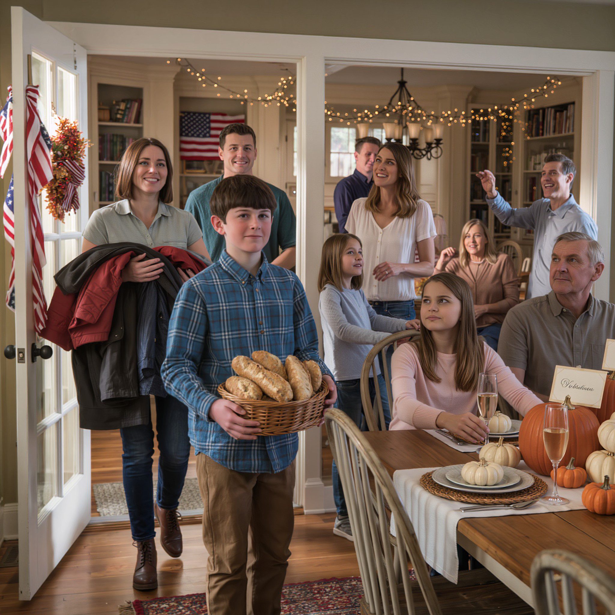 Mijn zoon stond daar met een mand vol zelfgebakken broodjes toen mijn zus over de tafel keek en zei: « Je zoon mag niet aan de tafel voor volwassenen zitten. »
