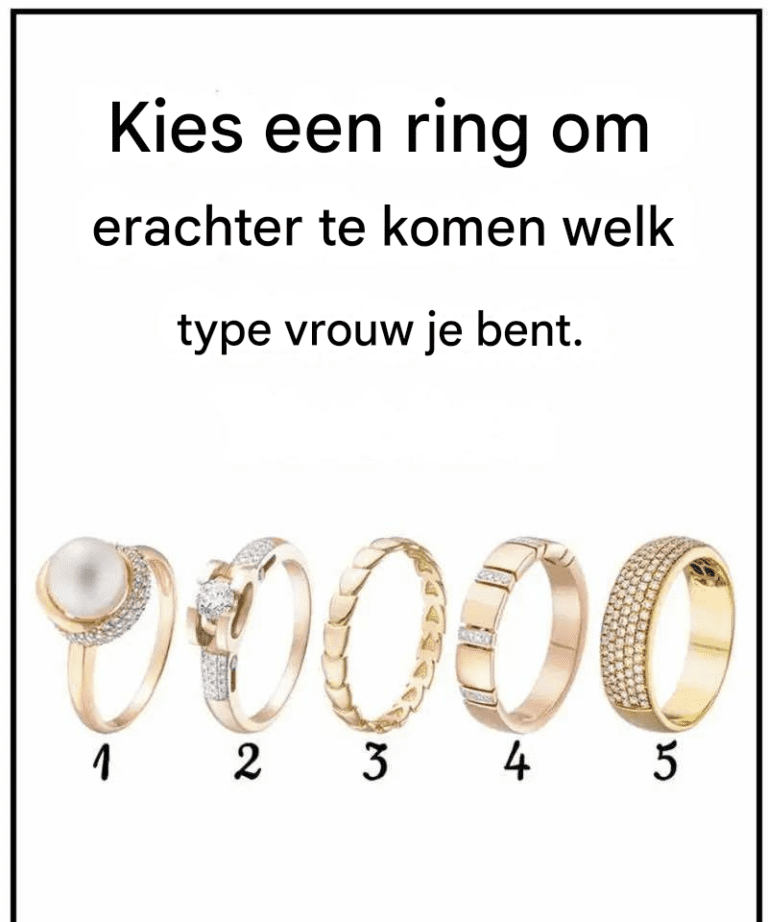 Bekijk de vijf ringen hieronder ( of stel je ze voor als je geen afbeelding hebt ) en kies spontaan de ring die je het meest aanspreekt. Ontdek vervolgens wat deze keuze over jou als vrouw zegt. Klaar? Laten we beginnen!