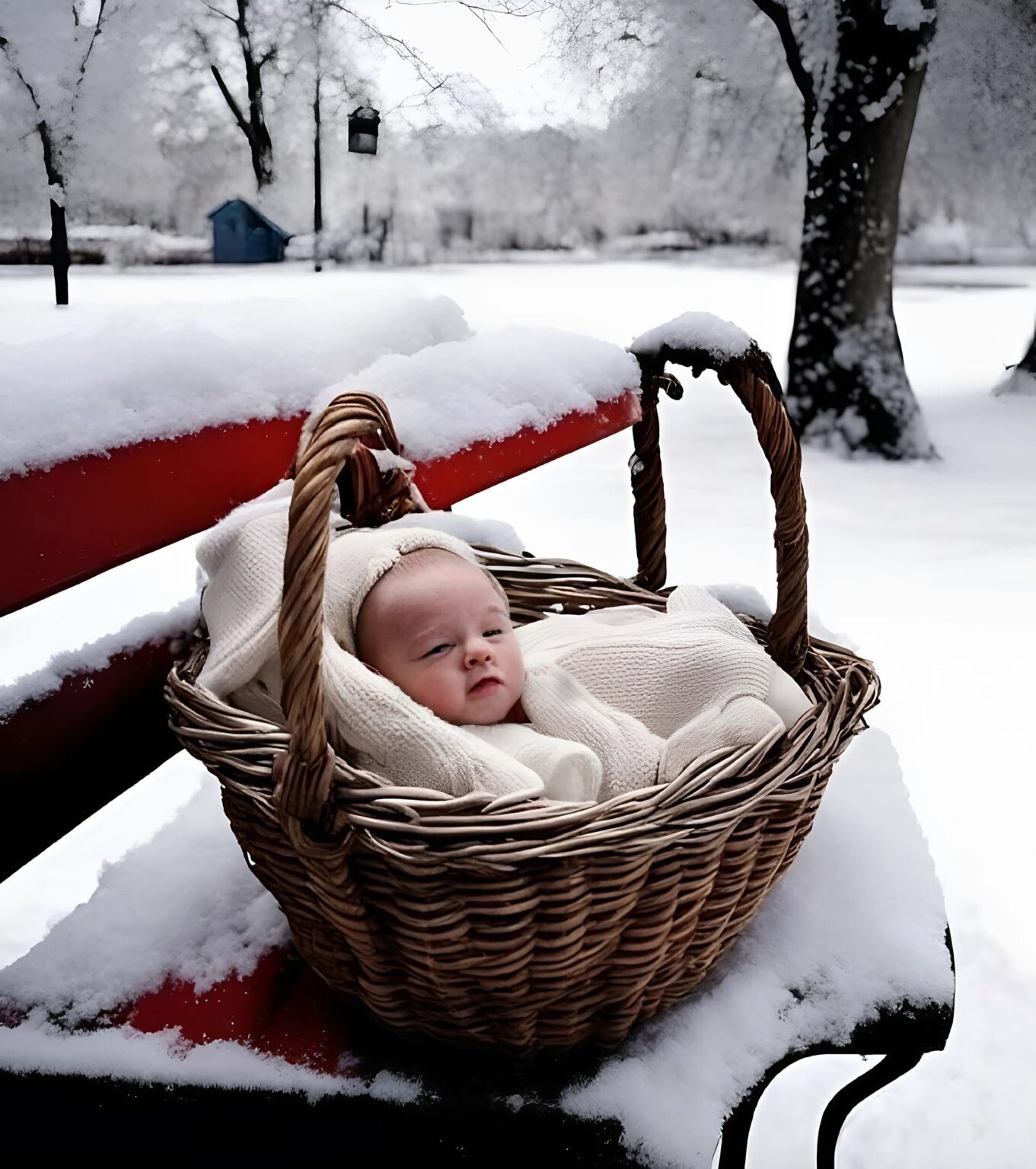 « Het lijkt die kant op te gaan! » zei Nikolai uiteindelijk, terwijl hij naar het stadspark rende. Daar, op een bankje dat al bedekt was met sneeuw, lag een bundeltje, waar het gehuil vandaan kwam.