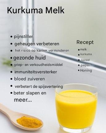 Kurkumamelk is een warme of koude drank gemaakt door melk (op basis van zuivel of planten) te mengen met gemalen kurkuma, soms verrijkt met zwarte peper, kaneel, gember of honing. Het staat bekend om zijn ontstekingsremmende, antioxiderende en immuunversterkende eigenschappen.