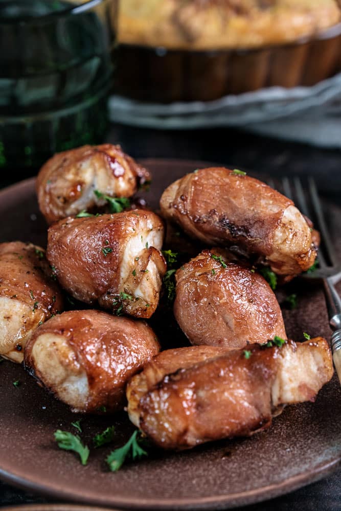 Deze kip bacon rolletjes zijn de perfecte combinatie van hartig en zoet. Met sappige kipfilet, knapperige bacon, een vleugje bruine basterdsuiker en gerookt paprikapoeder zijn ze simpelweg een onweerstaanbaar tapas hapje. De verse peterselie zorgt voor een frisse touch die het geheel helemaal afmaakt.