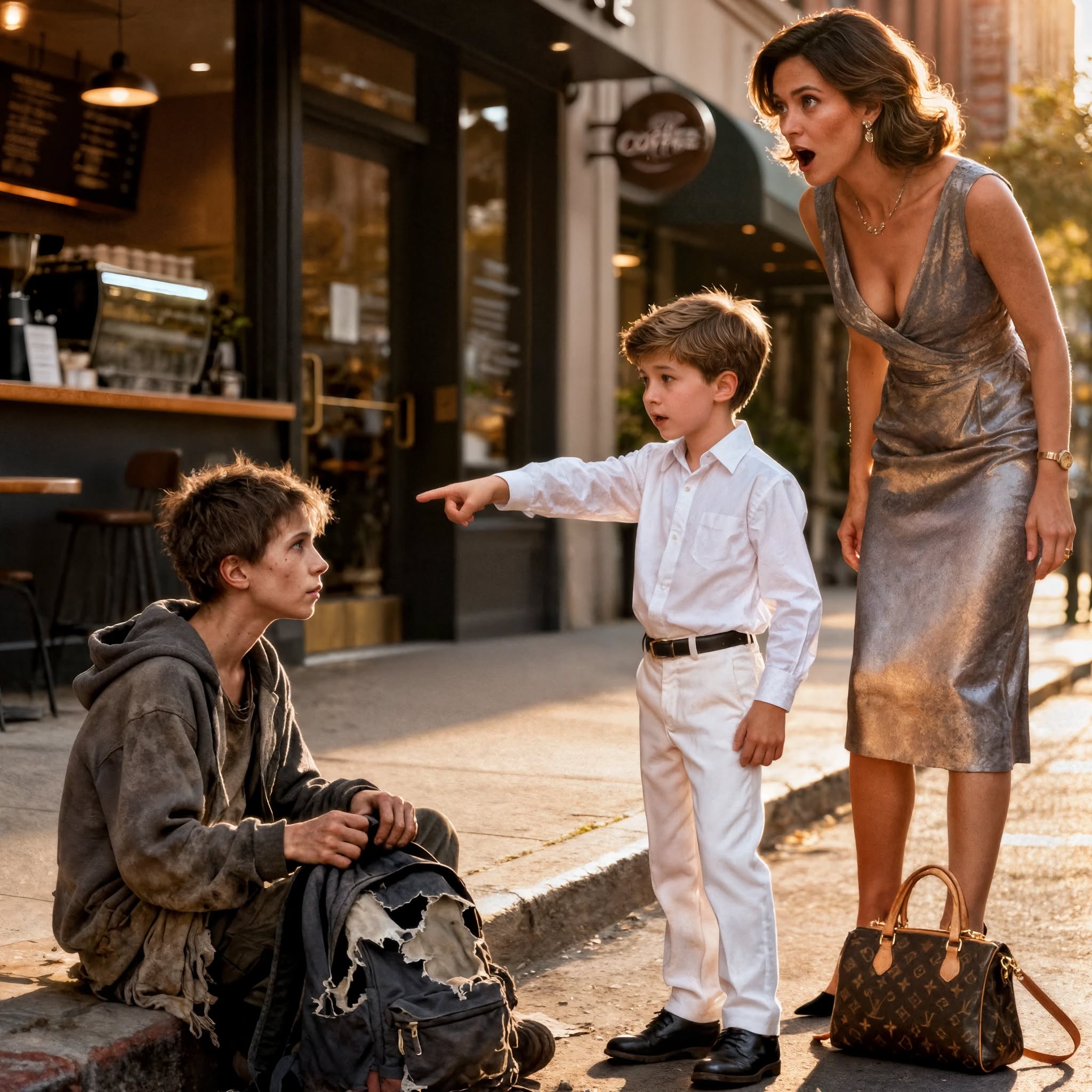 Aan de overkant van de straat, vlakbij de hoek van een bakkerij, zat een jongetje ineengedoken onder een kapotte paraplu. Zijn kleren waren doorweekt, zijn haar was verward en aan elkaar geplakt. Hij at wat er nog in een weggegooid boterhamzakje zat. Ondanks het vuil was er iets vreemd vertrouwds aan hem – dezelfde diepbruine ogen, dezelfde kuiltjes in zijn kin, dezelfde zachte ronding van zijn mond.