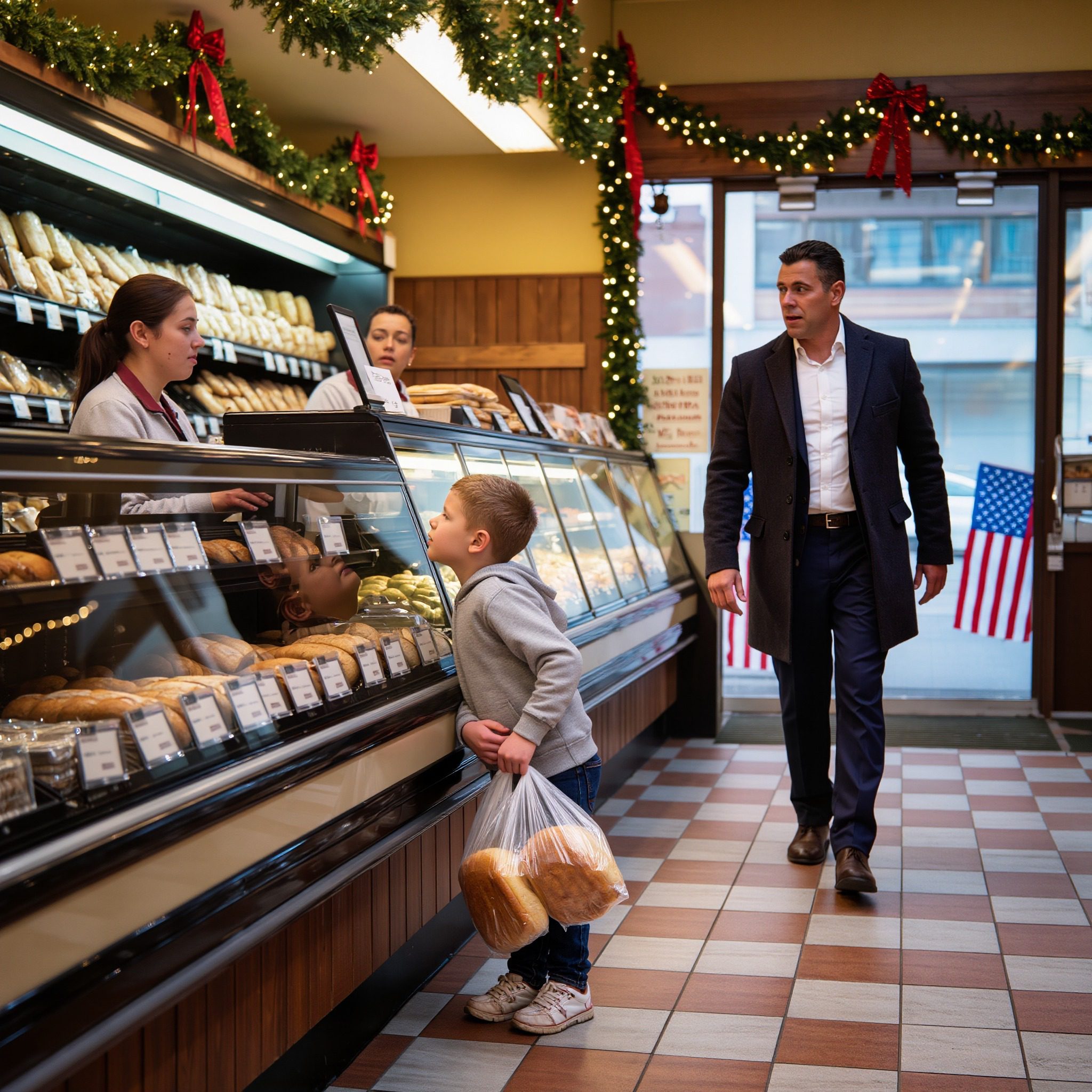 Hij keek om zich heen en zag een kleine bakkerij aan de overkant van de straat. De ramen, verlicht met kerstlichtjes, gloeiden zachtjes. « Golden Crust Bakery », stond er op het bord boven de deur. Door het raam zag hij broden en gebak uitgestald op rekken. De zaak zag er schoon en uitnodigend uit. Perfect. Ze zouden snel iets meenemen en weer naar huis gaan.