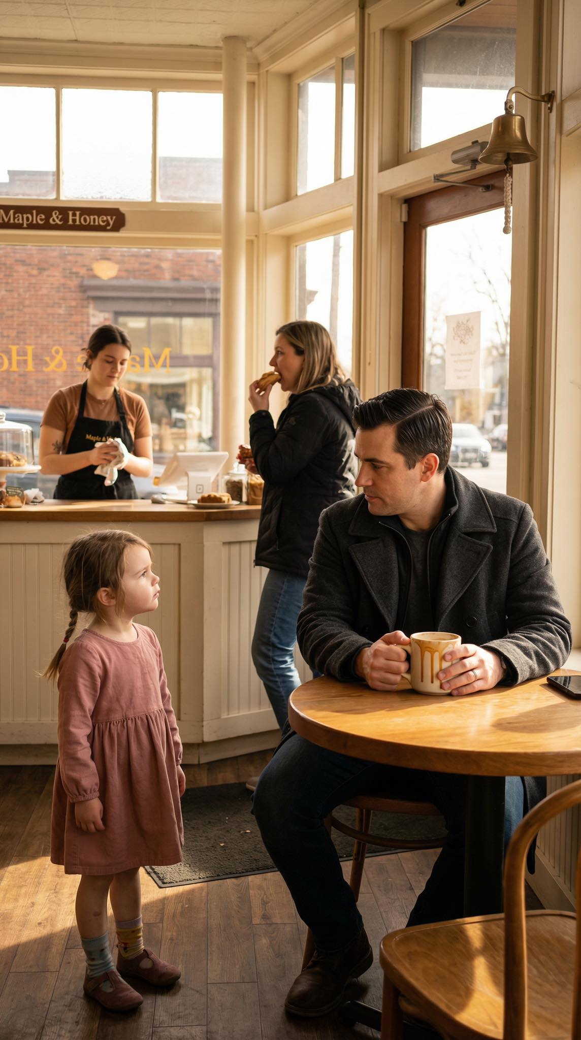 Ze kon niet ouder dan vijf jaar zijn geweest, met ongelijkmatige vlechten die met verschillende elastiekjes naar achteren waren getrokken en een geel vestje dat scheef dichtgeknoopt was, één knoopje te weinig voor een symmetrische look, alsof ze zich haastig in plaats van met zorg had aangekleed. Ze stond net binnen de deuropening, met een kleine roze rugzak in beide handen, en keek rond in het café alsof ze op zoek was naar iets belangrijks dat ze niet mocht kwijtraken.