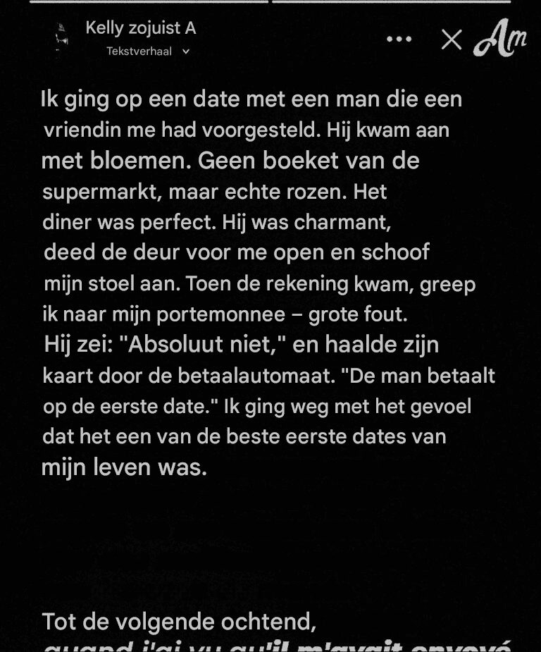 Toen Eric erop stond onze eerste date te betalen, dacht ik dat ik een echte heer had ontmoet. Rozen, een vriendelijk cadeau, een charmant gesprek – hij vinkte alle vakjes aan. Toen hij me de volgende dag sms’te, verwachtte ik een schattig vervolgbericht, maar mijn maag zonk toen ik zijn bericht las.