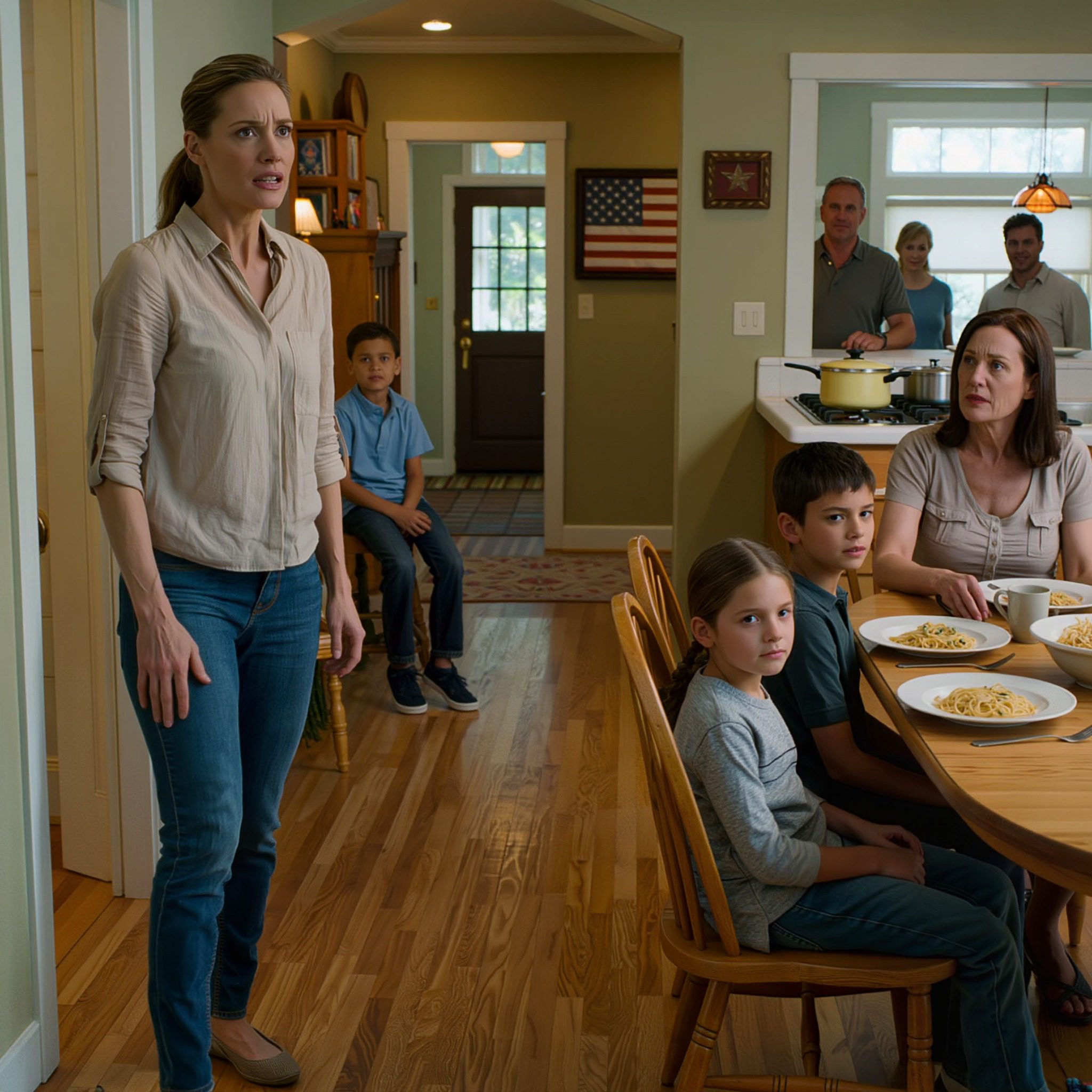 Toen ik om half zeven hun oprit opreed, hoorde ik kinderstemmen van binnen, maar er was iets anders. Het geluid was gescheiden. Sommige stemmen kwamen uit de eetkamer, andere uit wat klonk als de keuken. Ik pakte mijn sleutel en opende de deur. Jessica’s tweeling, Madison en Connor, zaten keurig aan de eettafel met volle borden en grote glazen melk. Mijn kinderen zaten met hun benen gekruist op de keukenvloer bij de deuropening, ze deelden wat leek op pindakaassandwiches en keken toe hoe hun neven en nichten aten wat naar zelfgemaakte spaghetti rook.