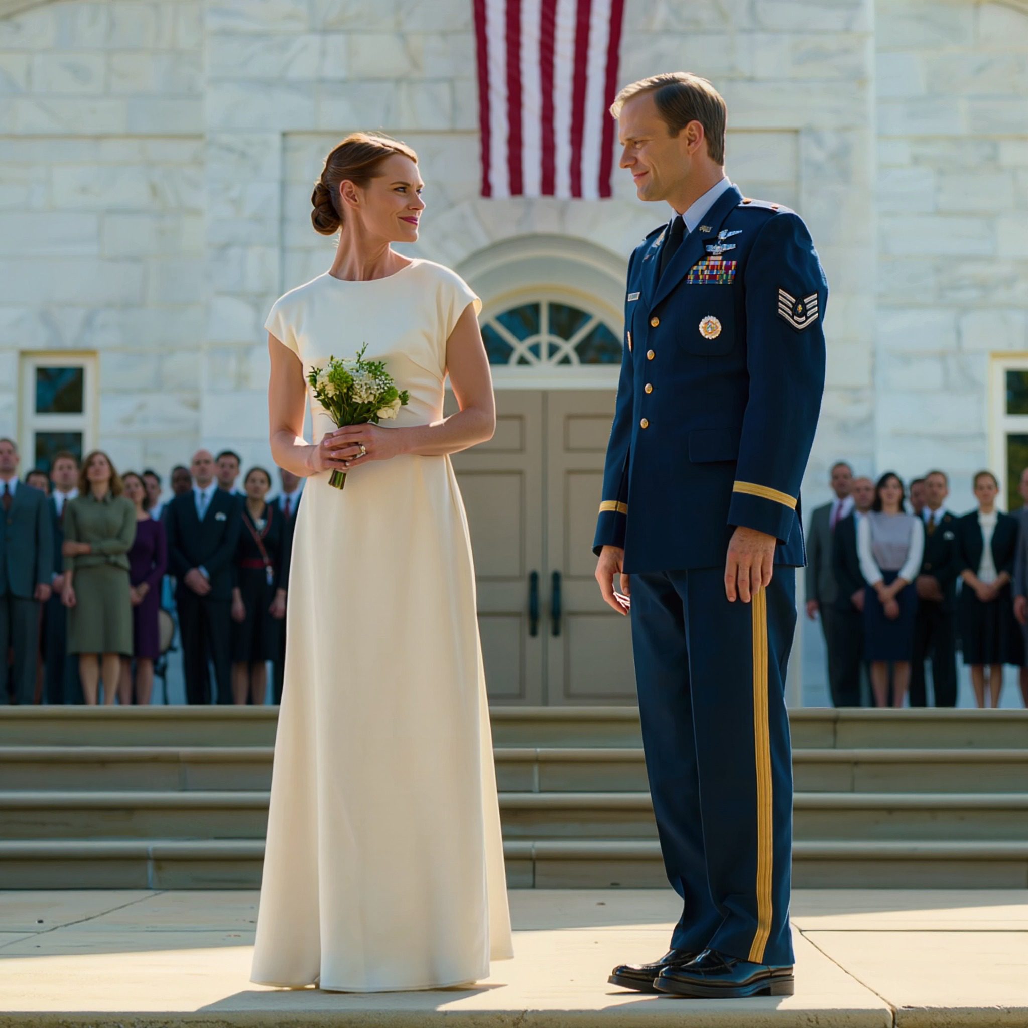 Het evenement was bescheiden maar formeel: gevouwen vlaggen op de tafels, een toast van kolonel Harper, officiële documenten die in drievoud waren ondertekend. Mark stond naast me in zijn gala-uniform. En toen hij de ring om mijn vinger schoof, voelde ik iets in mijn borst rusten. Niet zozeer geluk, eerder een soort zekerheid. Dit waren mijn mensen. Dit was mijn familie – degenen die waren komen opdagen.