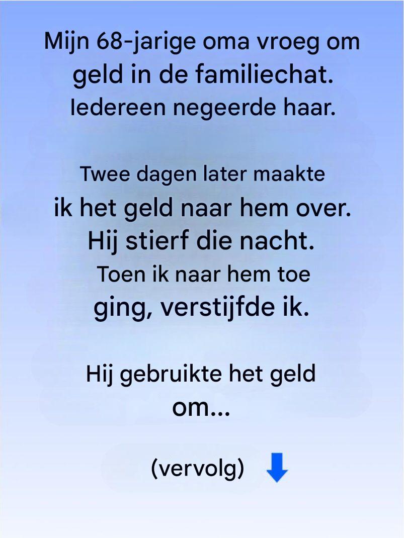 Ik ging zitten en trilde toen ik het bericht bovenaan las: « Ik heb er niet voor mezelf om gevraagd. Ik wilde iets achterlaten waar iedereen naar kon grijpen als ik er niet meer ben. Niet omdat ik wegga, maar omdat liefde gegeven moet worden zolang het kan. »