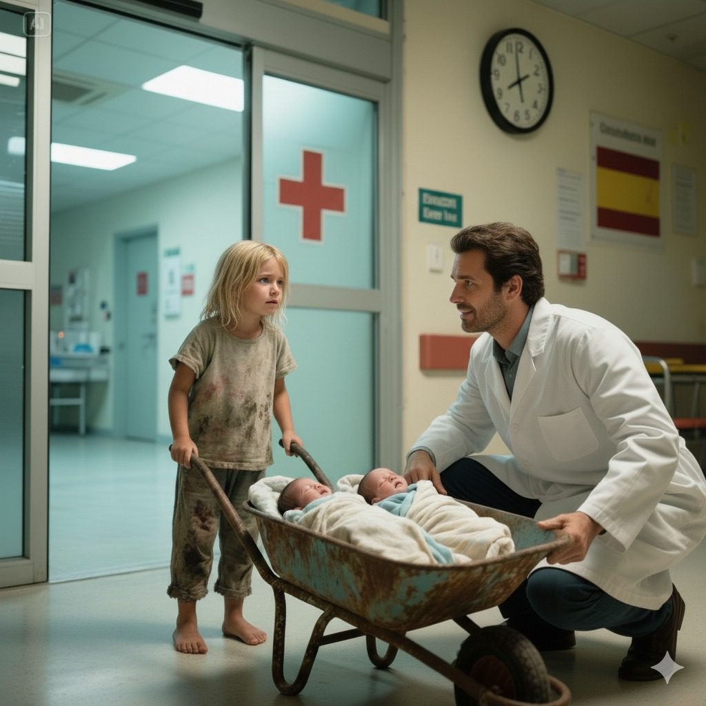 Toen de automatische deuren die ochtend openvlogen, verstijfde de triageverpleegkundige. Een meisje – niet ouder dan zeven – duwde een roestige kruiwagen door de deuropening. Binnenin, gewikkeld in een dunne deken, lagen twee pasgeborenen , hun gezichtjes bleek maar ze ademden.