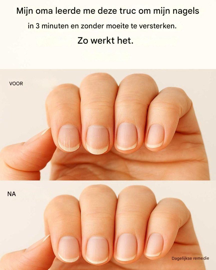 In onze snelle wereld staat zelfzorg vaak op de tweede plaats. Onze nagels, een van de meest blootgestelde delen van ons lichaam, lijden daar vaak onder. Door dagelijkse slijtage kunnen ze broos en kwetsbaar worden. Het onderhouden van sterke en gezonde nagels hoeft echter geen lastige opgave te zijn. Mijn oma leerde me een simpele truc waarmee je je nagels in slechts drie minuten kunt versterken, zonder enige moeite.
