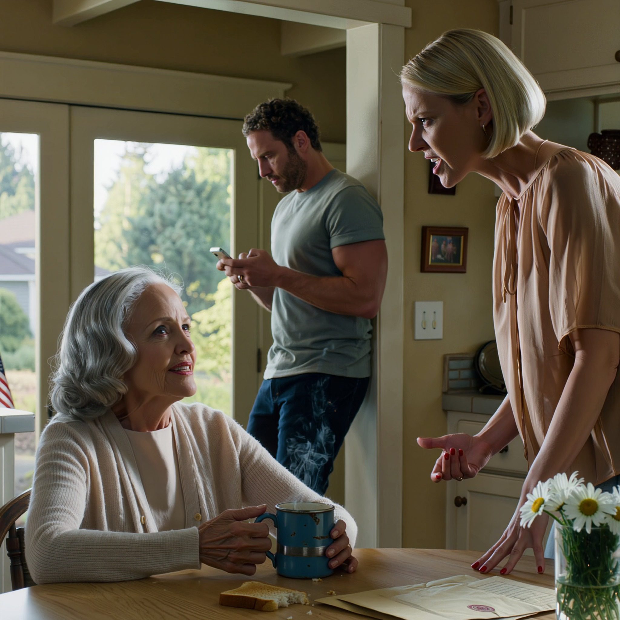 Tiffany stond voor me, met haar armen over elkaar, haar gezicht vertrokken in een minachtende uitdrukking die ik maar al te goed kende. Ze droeg een dure blouse die ik diezelfde ochtend nog voor haar had gestreken, en haar perfect gemanicuurde rode nagels glansden in het licht – dezelfde handen die in mijn huis nog nooit een afwas hadden gedaan.