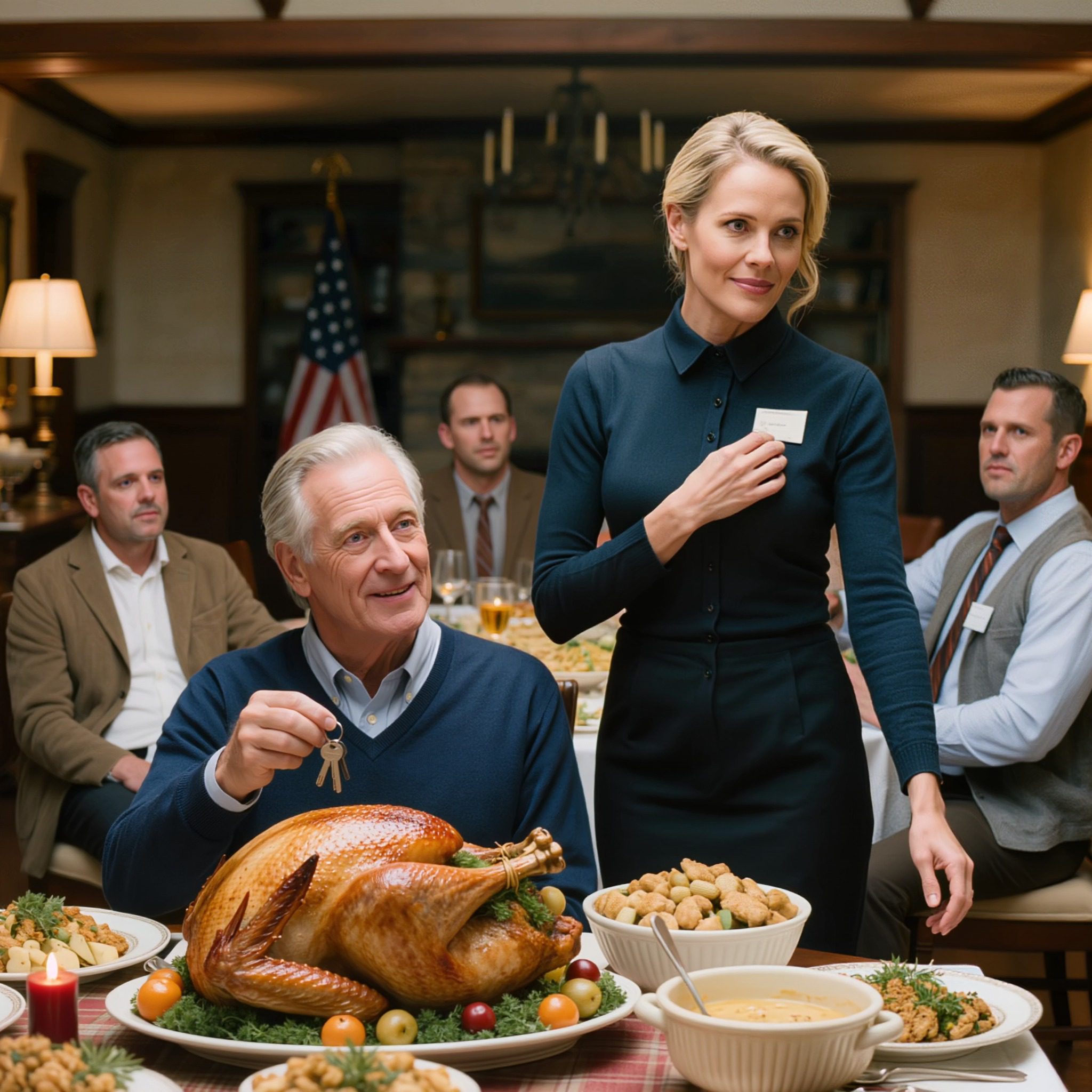 Tijdens het Thanksgiving-feest plakte mijn schoondochter een labeltje met ‘conciërge’ op mijn bord. Haar ouders barstten in lachen uit. Mijn zoon grinnikte: « De tafel is alleen voor echte familie – geen plaats voor losers. » Ik glimlachte, liet mijn huissleutels op de kalkoenschotel vallen en sprak drie woorden uit die hen allemaal tot sukkels maakten.