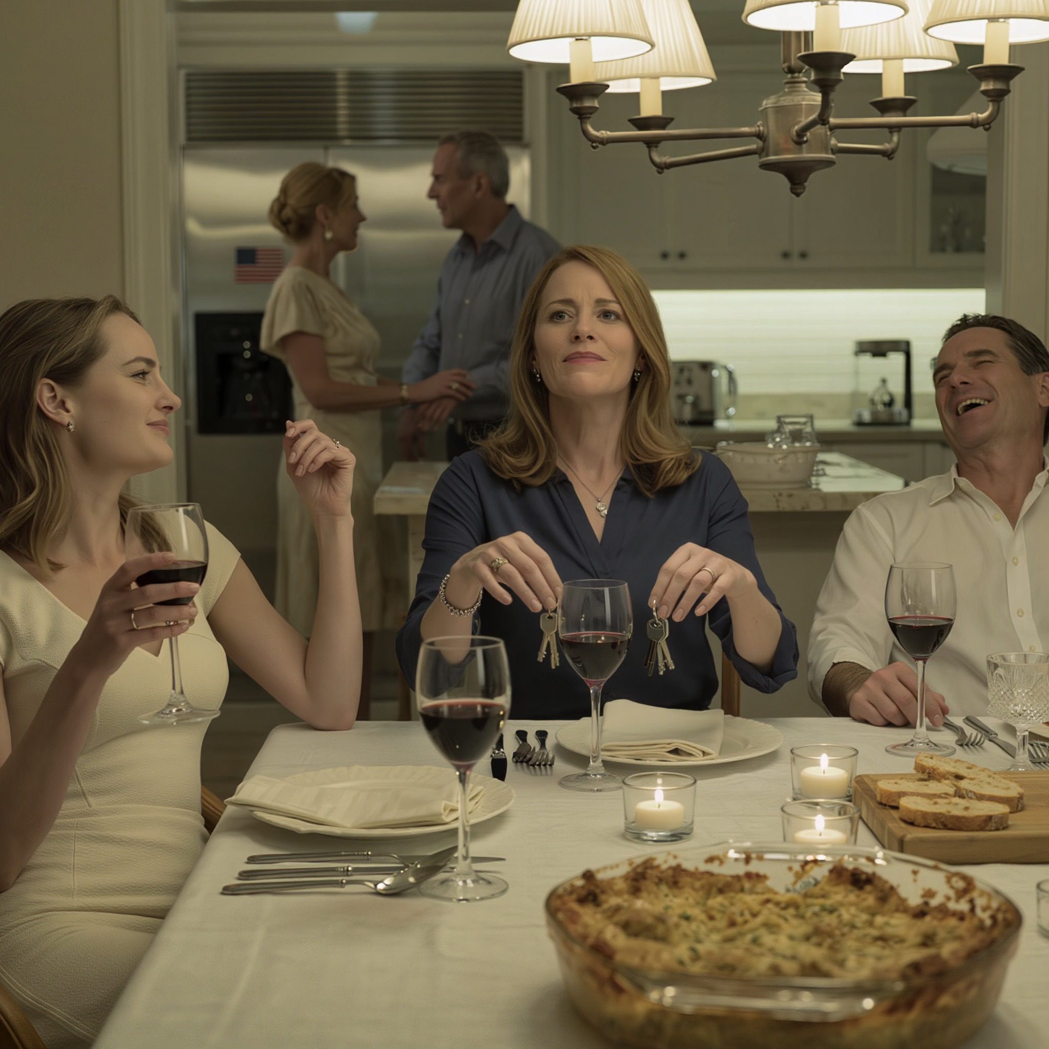 Aan mijn eigen eettafel hief mijn stiefdochter haar glas en zei: « Op papa’s huishoudster. Bedankt voor het koken. » Iedereen lachte, zelfs mijn man. Ik maakte geen ruzie. Ik pakte gewoon de huissleutels en legde ze voor haar bord neer, pal naast het wijnglas dat ze vasthield alsof ze de eigenaar van het huis was.