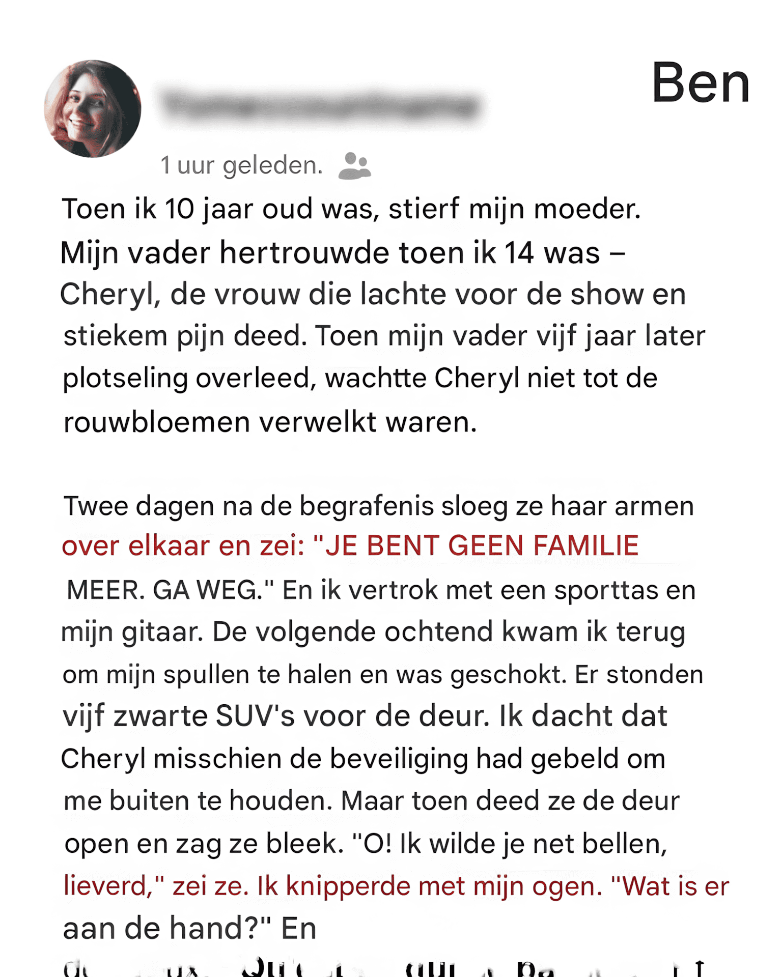 Cheryl kwam bij me toen ik 14 was. Ze droeg parfum waar ik hoofdpijn van kreeg en een glimlach die haar ogen nooit leek te bereiken als ik in de buurt was. Papa vond haar warm en stralend. En eerlijk gezegd, ze gaf hem een perfecte show.