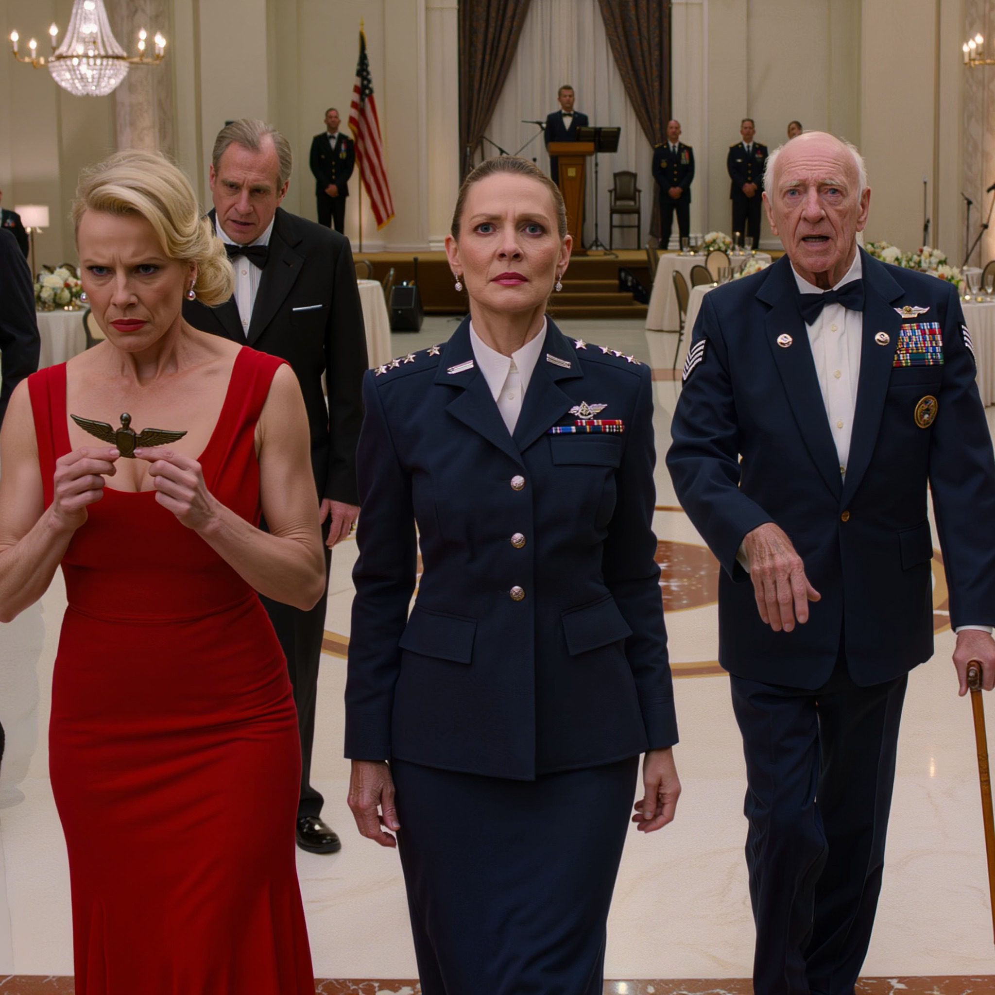 Ze was tweeënvijftig, maar ze vocht met een wanhoop tegen het ouder worden die pijnlijk was om te zien. De jurk die ze had uitgekozen was te rood en te strak voor een formeel militair gala – een jurk om alle aandacht op te vestigen, ontworpen om gezien te worden voordat iemand anders dat deed.