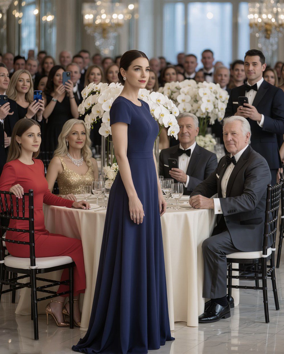 De kristallen balzaal van het Grand View Hotel fonkelde onder de kroonluchters. Ronde tafels, gedrapeerd met ivoorkleurig linnen, omringden het podium, elk versierd met witte orchideeën die waarschijnlijk meer kostten dan mijn wekelijkse boodschappen. Camera’s stonden op de achtergrond klaar.