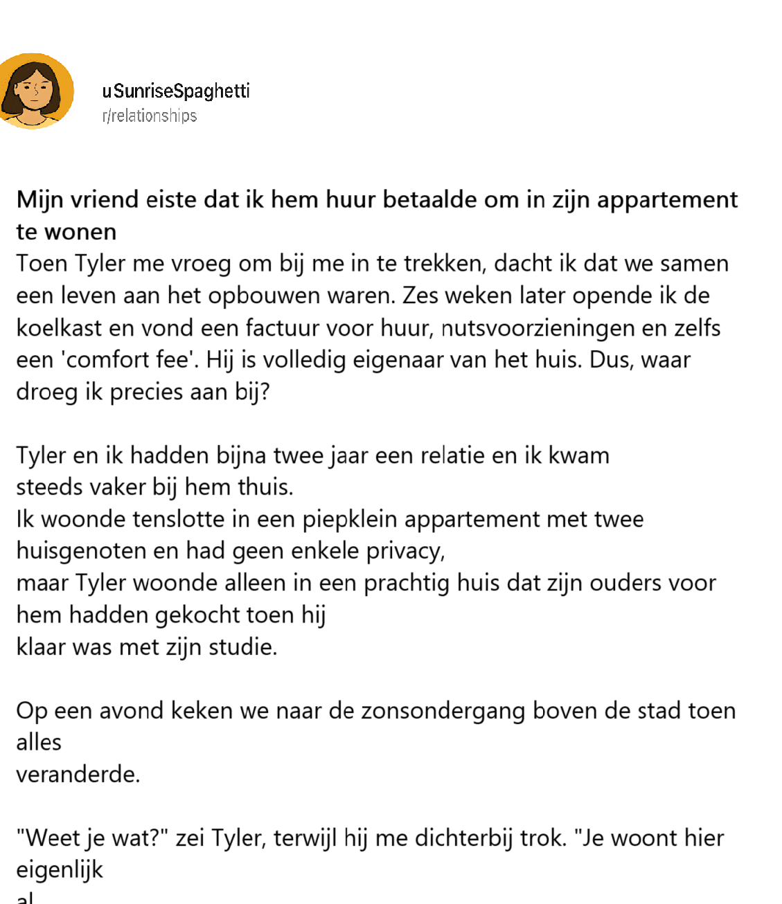 Toen Tyler me vroeg om bij me in te trekken, dacht ik dat we samen een leven aan het opbouwen waren. Zes weken later opende ik de koelkast en vond een factuur voor huur, nutsvoorzieningen en zelfs een ‘comfort fee’. Hij is volledig eigenaar van het huis. Dus, waar droeg ik precies aan bij?
