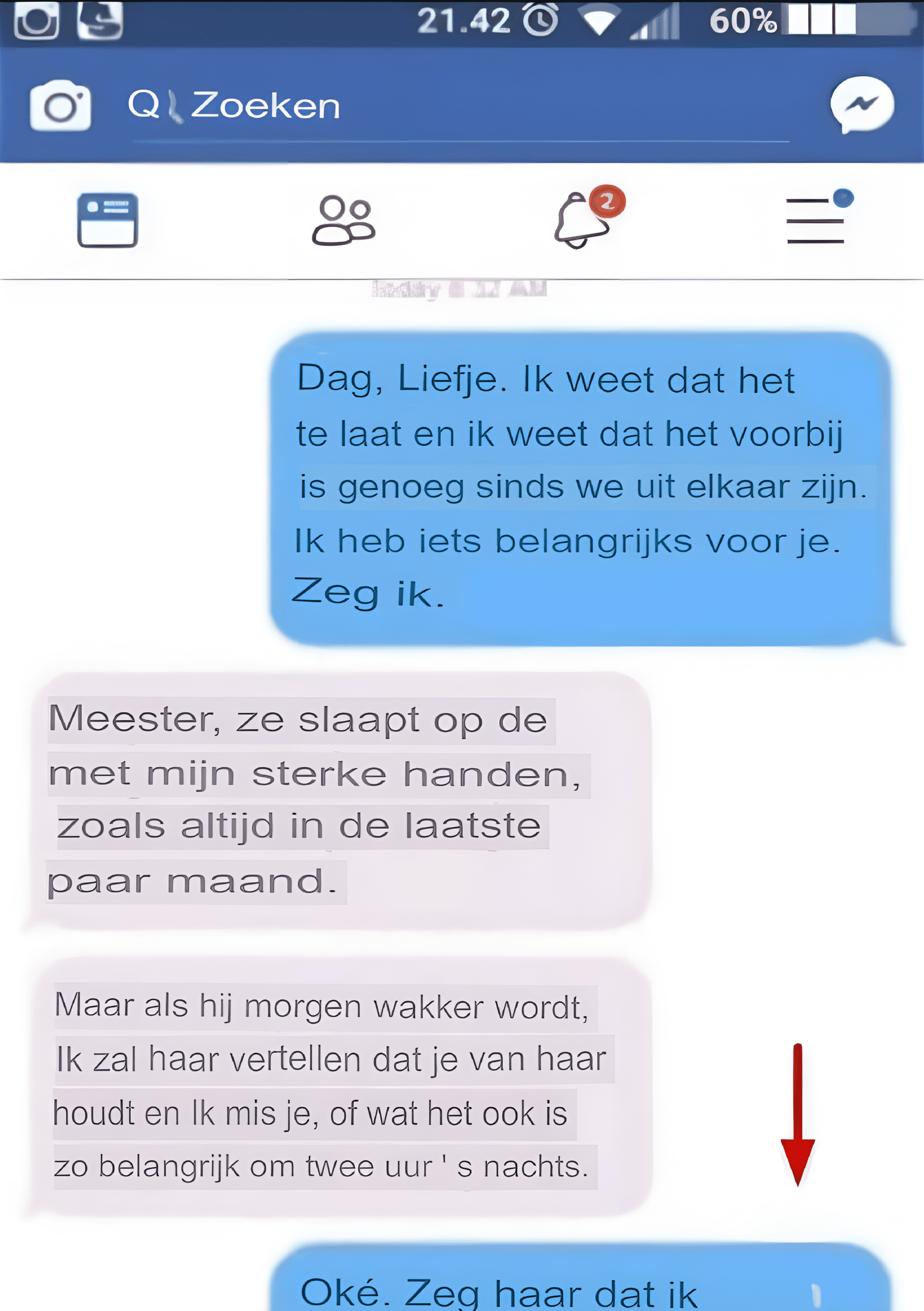 En: « Zijn tweede bericht heeft mij compleet van mijn stuk gebracht. »