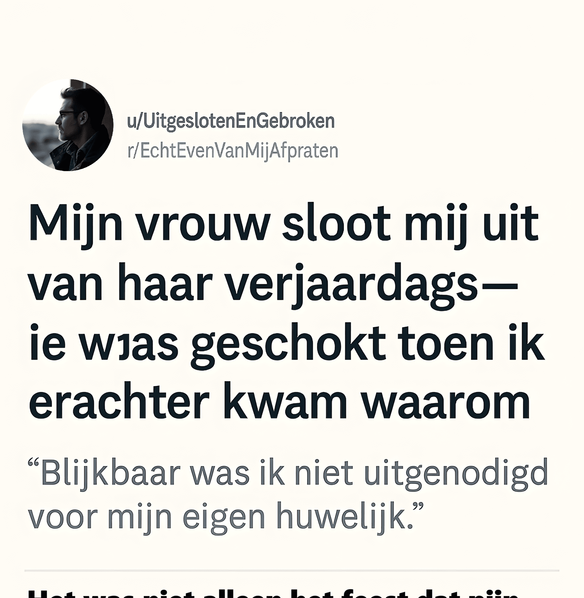 Ik dacht dat mijn vrouw Jenna en ik alles deelden, inclusief onze diepste geheimen. Maar toen ze me uitsloot van haar verjaardagsfeestje, besefte ik dat ik bij meer dan één feestje was buitengesloten. Wat het meest pijnlijk was, was ontdekken waarom.
