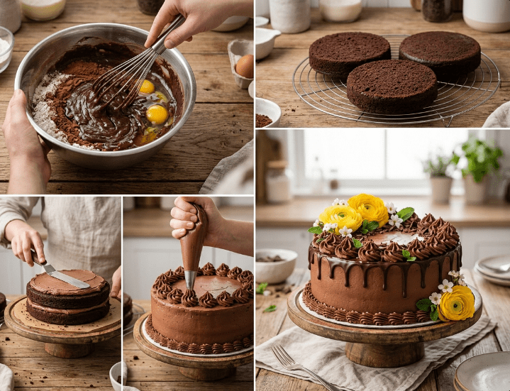 Stap 4: Giet het beslag in twee goed ingevette en met bloem bestrooide taartvormen van 22 cm en bak ze in een voorverwarmde oven op 180 °C gedurende ongeveer 30 minuten. Haal de taarten na het bakken uit de oven, ontvorm ze en laat ze volledig afkoelen op een rooster.