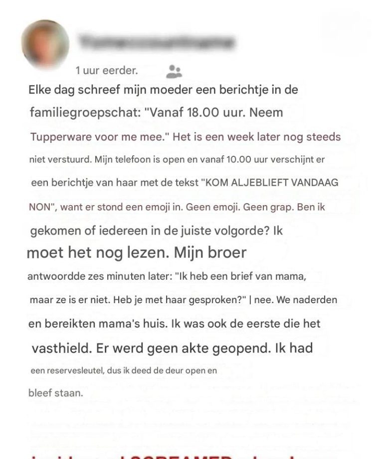 Elke zondagmorgen stuurde ze, als een klok, een berichtje naar de familiechatgroep:
