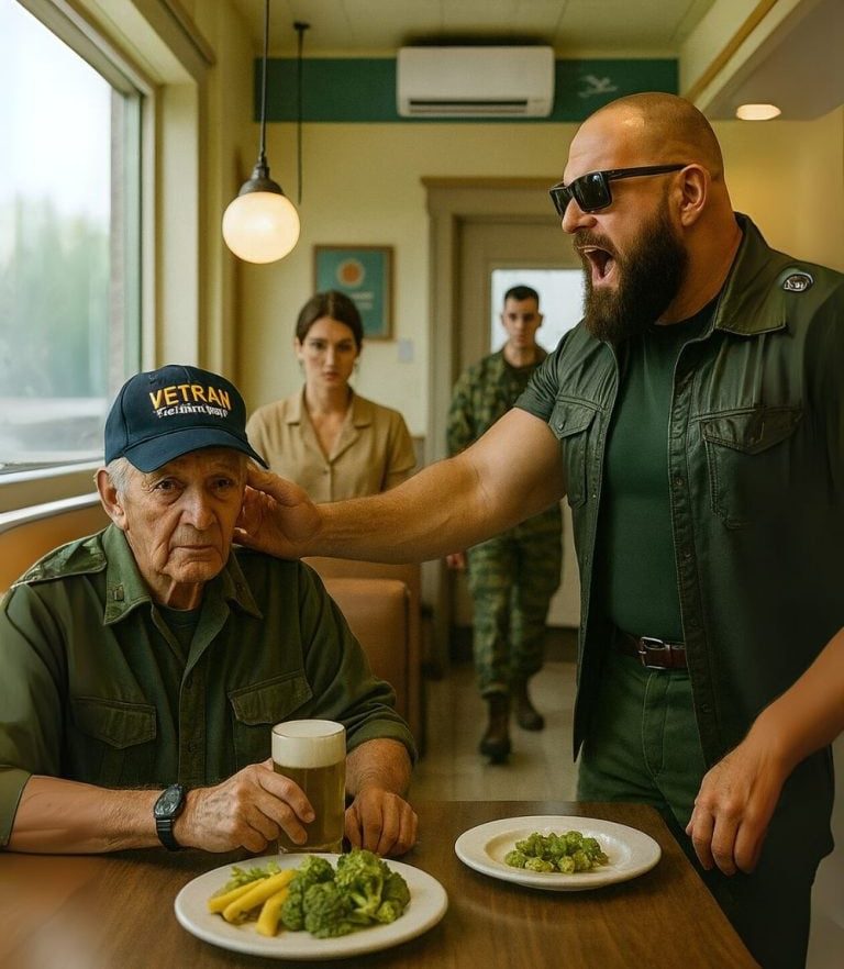 De veteraan keek langzaam op. Zijn stem, hoewel kalm, droeg de zwaarte van iemand die veel ergere dingen had meegemaakt. « Jongen, ik heb grotere gevechten geleverd dan jij. Als je de stoel wilt, neem hem dan. »