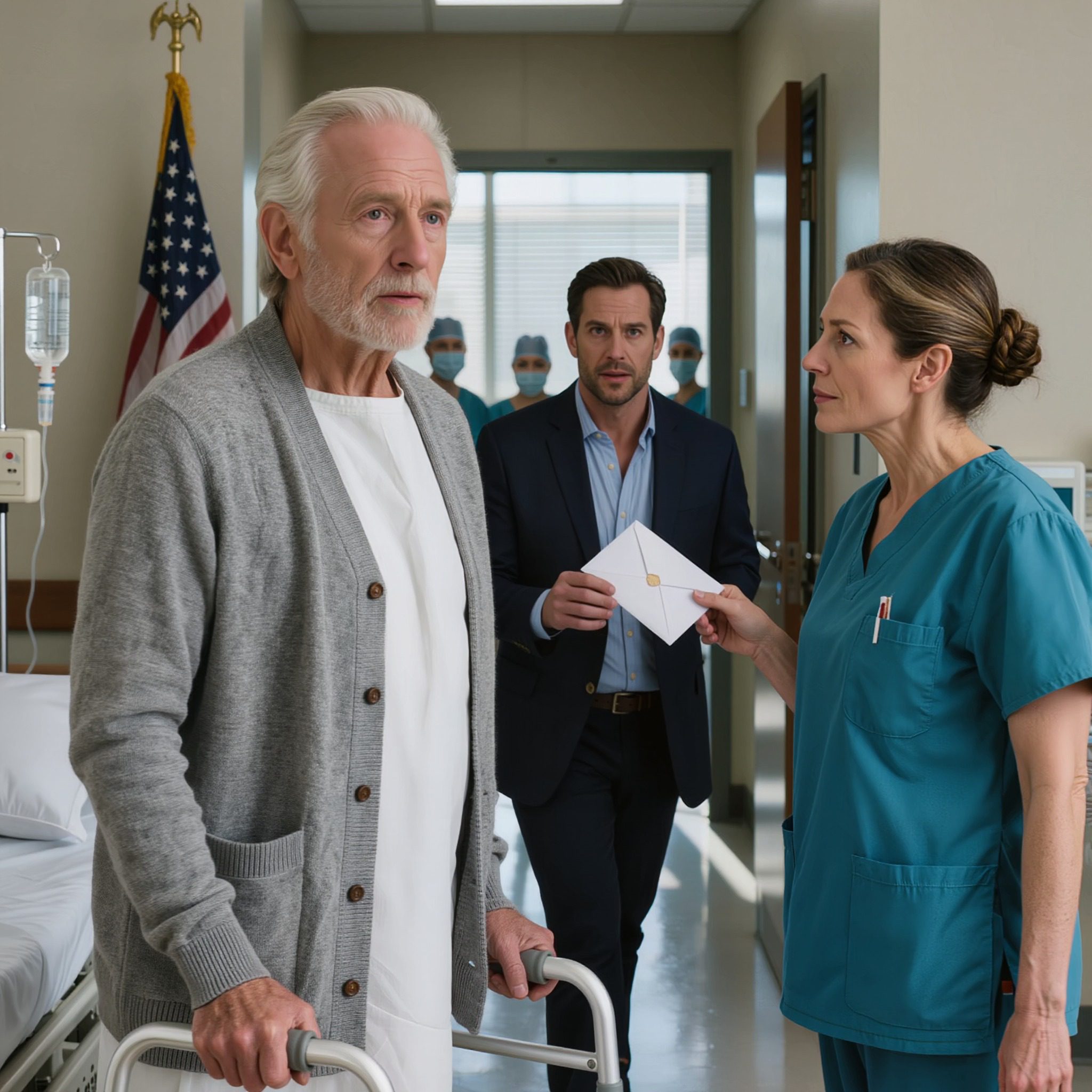 Ik raakte buiten bewustzijn na een auto-ongeluk. Mijn zoon noemde me een « lastige oude man » en liet me alleen achter in het ziekenhuis. Vijf dagen later kwam hij terug en eiste dat ik mijn huis verkocht. Maar toen hij zag dat mijn bed leeg was, glimlachte de verpleegster alleen maar en gaf hem een envelop. Wat erin zat, maakte hem doodsbang.