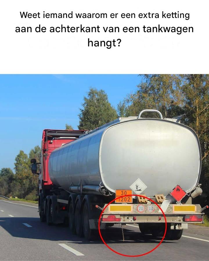 De extra ketting die aan de achterkant van een tankwagen hangt, dient als aardingsvoorziening. Het belangrijkste doel is het afvoeren van statische elektriciteit die kan ontstaan tijdens het transport van brandbare vloeistoffen. Tijdens het rijden van de vrachtwagen kan de wrijving tussen de vloeistof en de tank, evenals de beweging van de vrachtwagen zelf, statische elektriciteit opwekken. Indien niet goed beheerd, kan deze statische lading leiden tot vonken, die een aanzienlijk risico vormen op het ontbranden van de brandbare lading. De ketting sleept over de grond en biedt een pad waarlangs de statische elektriciteit veilig in de aarde kan worden afgevoerd, waardoor het risico op brand of explosie wordt verminderd.