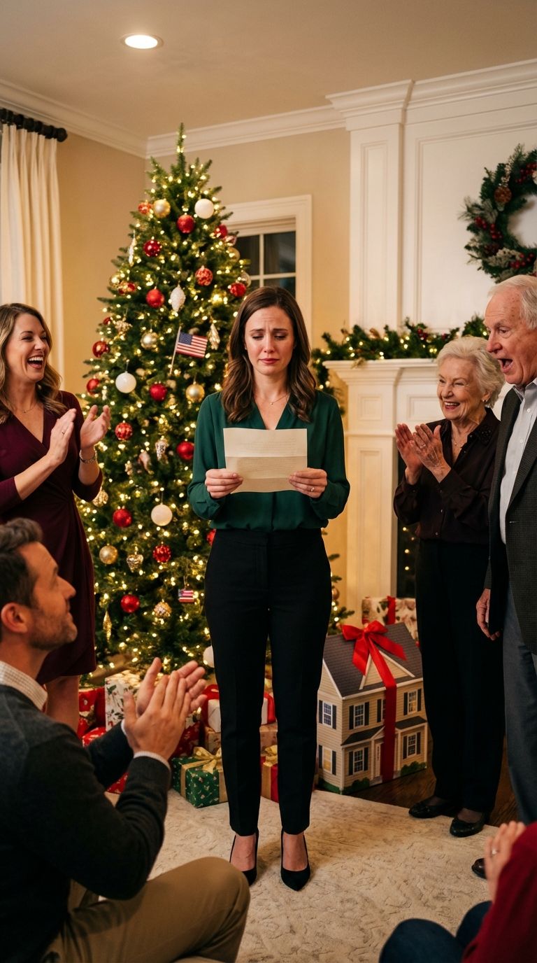 Het huis rook naar kaneel en dennen, precies zoals altijd tijdens de feestdagen. Mijn vader zat in zijn leren fauteuil met een glas whisky en staarde naar het vuur alsof het een privé-audiëntie was. Vanessa zat naast haar man, Derek, op de bank; ze zagen er allebei uit alsof ze zo uit een Hallmark-reclame waren gestapt: haar haar in perfecte blonde golven, zijn pak gestreken, hun glimlachen perfect op elkaar afgestemd.