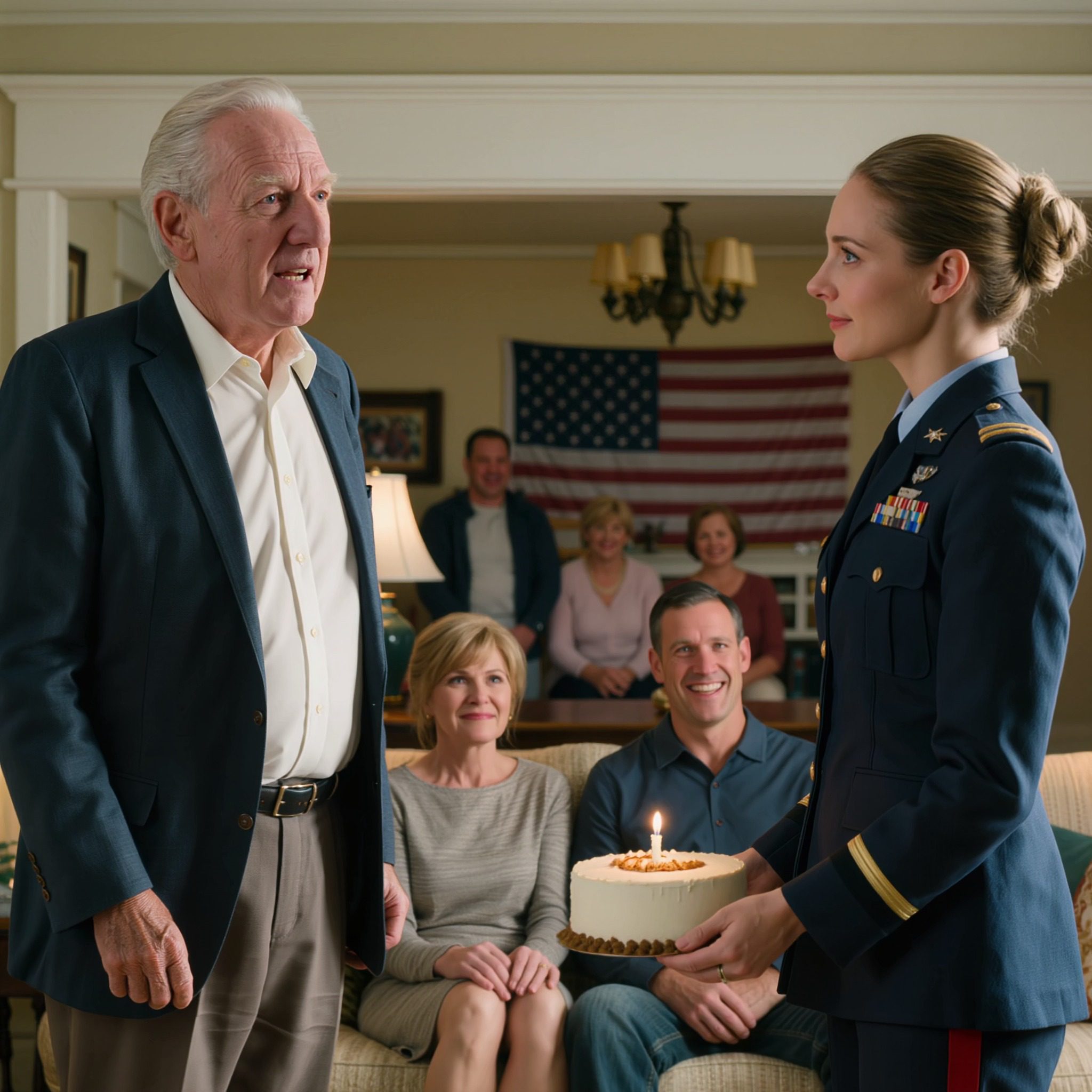 De woonkamer voelde kleiner aan dan normaal toen ik in mijn gala-uniform binnenkwam. Mijn ouders zaten keurig op de bank, met een stralende, uitnodigende glimlach, maar er hing iets geënsceneerds aan de scène. Opa stond bij het raam, zijn militaire houding nog steeds duidelijk zichtbaar ondanks zijn leeftijd. En toen hij zich omdraaide om me te begroeten, lichtte zijn gezicht op van oprechte trots.