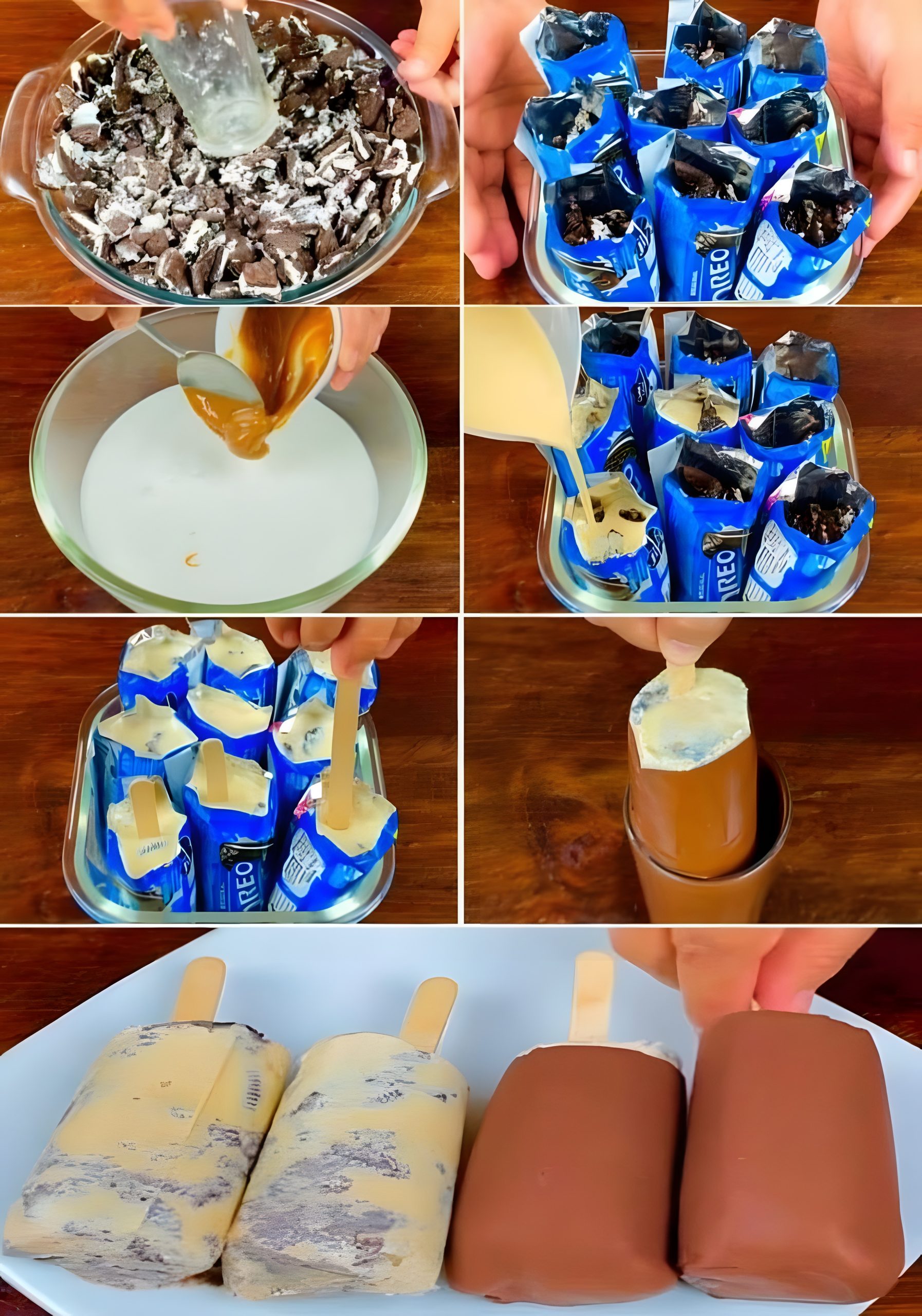 Geniet van deze heerlijke Oreo-ijsjes met een romige vulling van dulce de leche en een optionele chocoladecoating. Dit eenvoudige en leuke recept is perfect voor warme dagen!