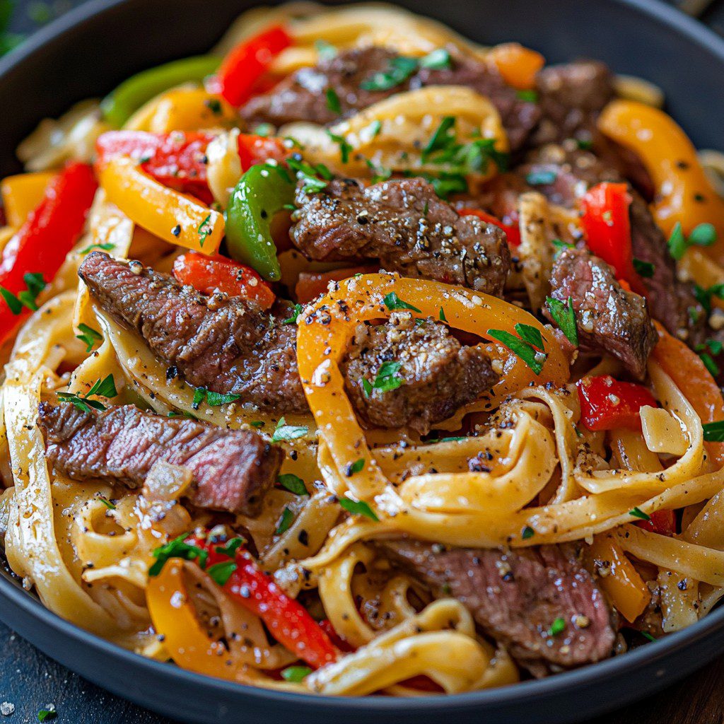 Philly Cheese en Steak Friet Ingrediënten (voor 3-4 personen) 450 g dun gesneden biefstuk (flank, rump of sirloin) 1 tl knoflookzout 1/2 tl gemalen zwarte peper 1 groene paprika, ontpit en in dunne plakjes gesneden 1 dun gesneden ui 8-10 plakjes Amerikaanse witte kaas (of smeltende witte cheddar, mozzarella of provolone) 590 g diepvrieswafelfriet (zoals … Lire plus