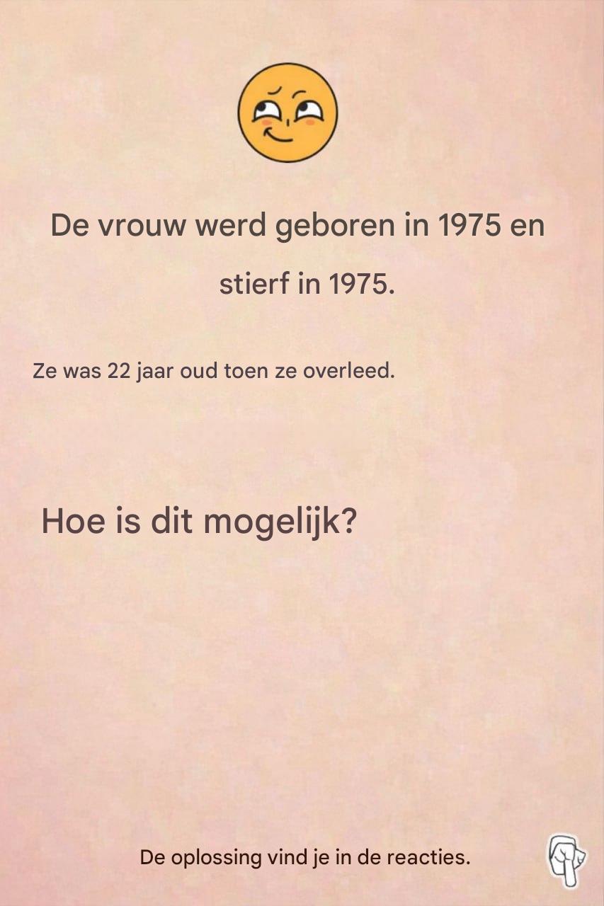 Stel je voor dat je deze vreemde zin op het nieuws ziet: « Een vrouw werd geboren in 1975 en stierf in 1975. Ze was 22 jaar oud. » Plotseling sta je stokstijf. Onbegrijpelijk? Verrassend? Er moet ergens een valstrik zitten… Maar waar? Houd je vast, want deze puzzel stelt je logica, je reflexen en je verbeeldingskracht … Lire plus