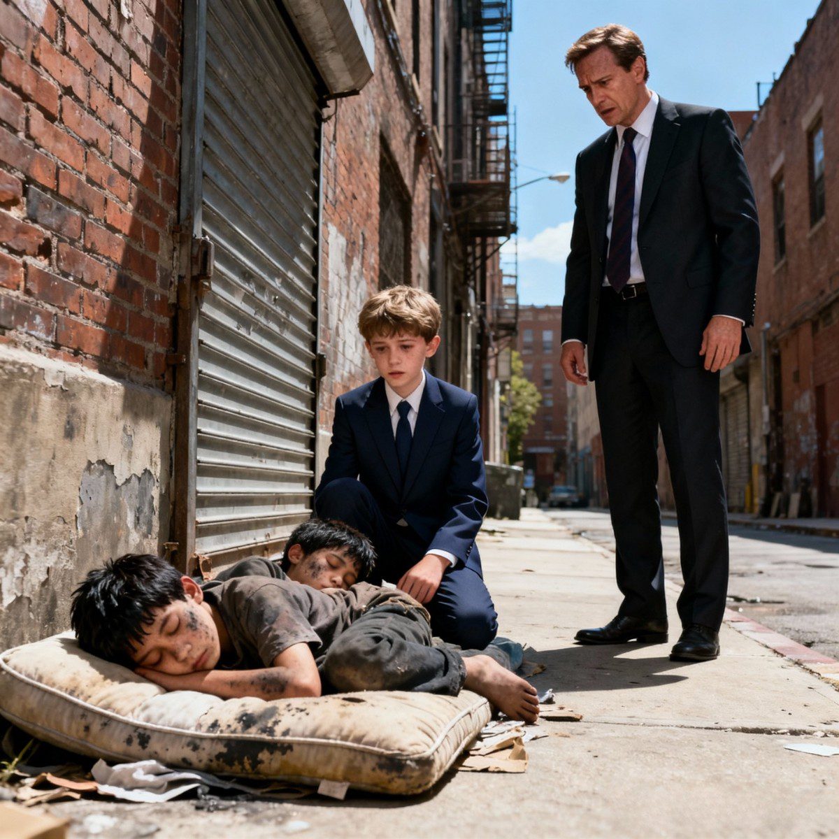 Hun verfomfaaide kleren hingen als vodden om hun tengere lichamen. Hun gezichten waren bleek en mager, met diepe, donkere kringen onder hun ogen. Hun doffe, vermoeide ogen verraadden dagen zonder goede voeding of rustgevende slaap. Naast hen, op de vieze matras, lag een bijna lege waterfles en een gescheurde plastic zak met restjes oud brood. Hun kleine handen waren vuil en beurs, met snijwonden en schrammen, waarschijnlijk opgelopen tijdens het zoeken naar iets te eten in het afval.
