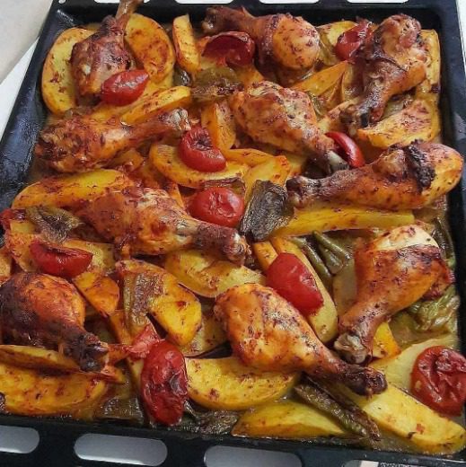Eenmaal gaar, haal de kip en aardappelen uit de oven en garneer indien gewenst met verse peterselie.