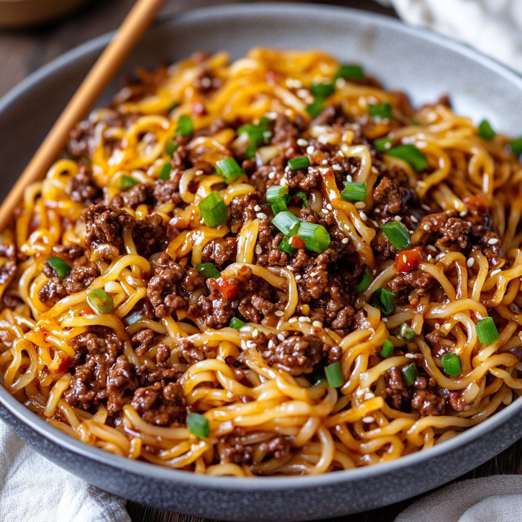 Voeg het rundvlees toe, daarna de noedels. Roerbak 2 tot 3 minuten op hoog vuur tot alles goed bedekt en door en door warm is.