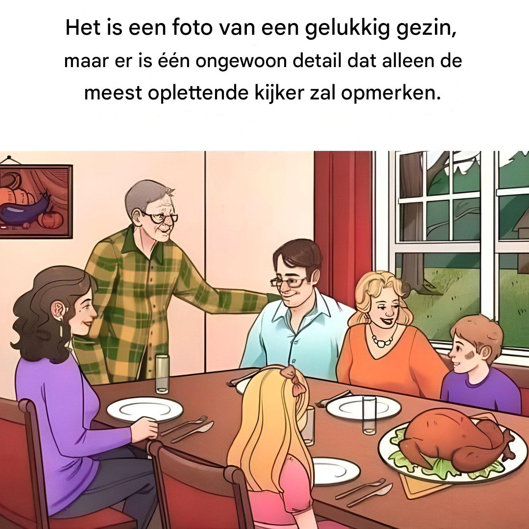 We zijn dol op deze kleine visuele puzzels die ons doen fronsen, turen en plotseling zeggen: « Maar natuurlijk! » wanneer we de oplossing ontdekken. Deze heeft net dat beetje extra dat de geest wakker schudt en de nieuwsgierigheid prikkelt. Stel je voor: een gezin dat samenkomt voor een maaltijd, een warme sfeer, een grote kalkoen in het midden van de tafel… Alles lijkt normaal. En toch klopt er één detail niet. Kun jij het vinden?