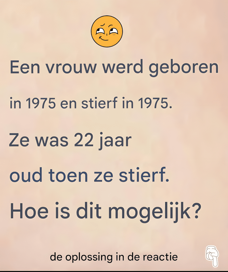Stel je voor: je komt deze vreemde zin tegen terwijl je door je nieuwsfeed scrolt. « Een vrouw werd geboren in 1975 en stierf in 1975. Ze was 22 jaar oud. » Je staat perplex. Onbegrijpelijk? Verontrustend? Er zit duidelijk ergens een addertje onder het gras… Maar waar? Houd je vast, want dit raadsel daagt onze logica en onze reflexen uit en vereist een vleugje verbeeldingskracht. Wat als de sleutel nu juist was om niet zoals gewoonlijk te denken?